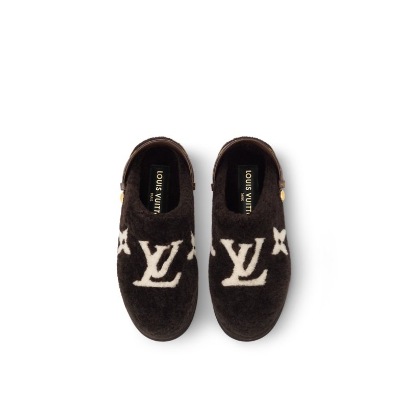 The Aspen comfort clog is revisited this season in fluffy shearling decorated with Monogram Flowers and the LV Initials in a contrasting shade. This model is characterized by its removable back strap in Monogram canvas, which is secured with engraved, gold-toned studs. A chunky yet lightweight rubber outsole completes this design.