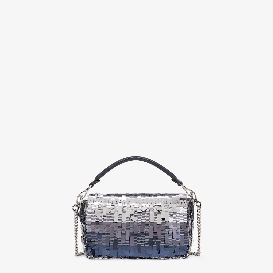 Iconic mini Baguette bag with all-over embroidery in metallic sequins of different shapes and sizes that create a gradient effect in shades of blue. Decorated with an FF clasp.