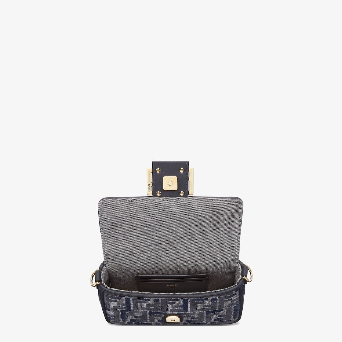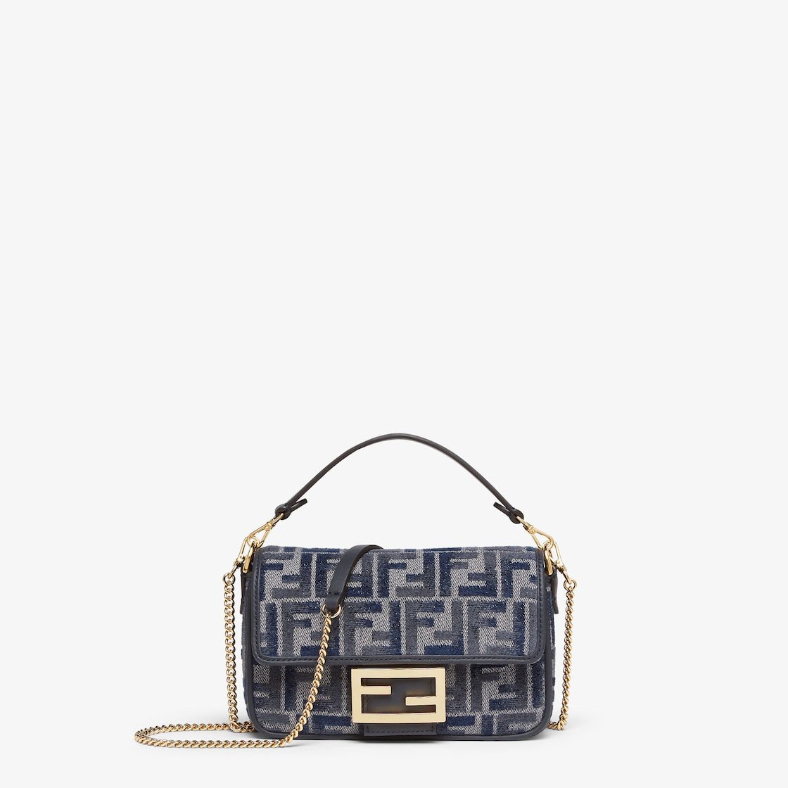 Small iconic Baguette bag made of chenille with the iconic FF motif in dark blue gradient tones, embellished with dark blue calfskin trim and decorated with an FF clasp.