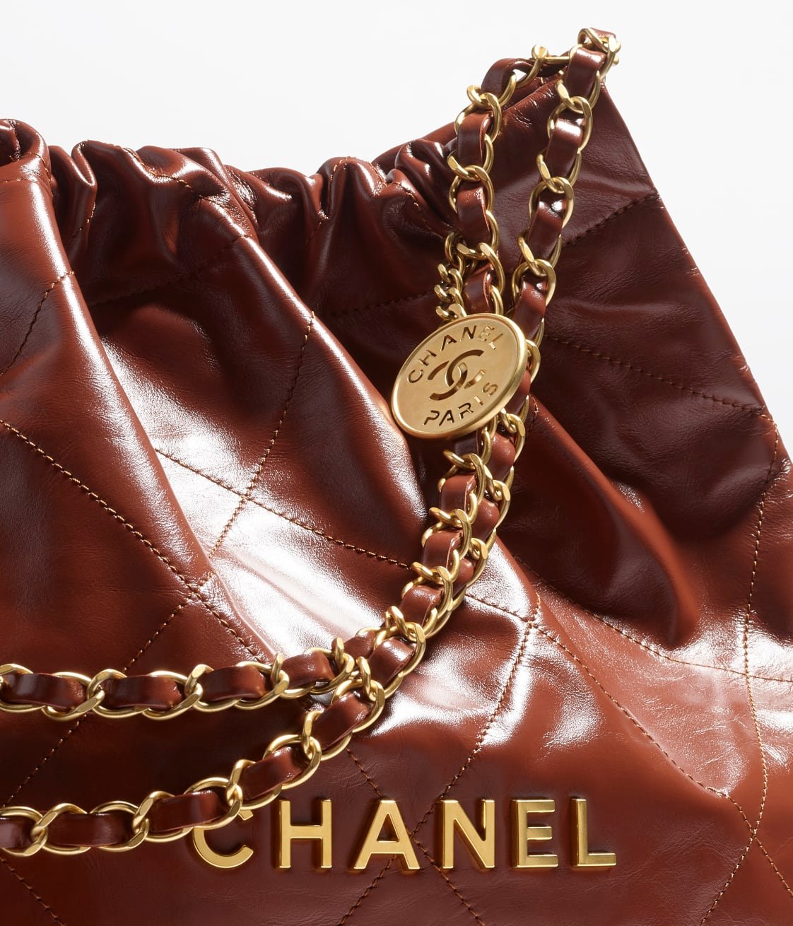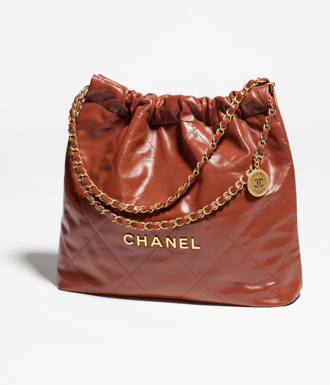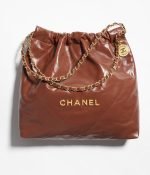 The 22 Hobo is crafted from brown calfskin leather with gold-tone hardware, featuring signature diamond quilting, gold-tone metal on the front, and a long chain interwoven with gold and brown leather.
