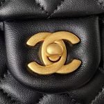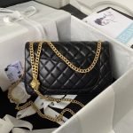 The Camellia Crush rectangular flap bag in Rose Clair lambskin with antique gold hardware features a front flap with CC turnlock closure, rear half-moon pockets and an adjustable antique gold interwoven chain shoulder/crossbody strap with camellia accents.