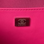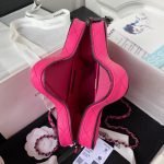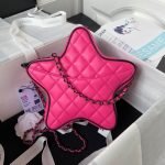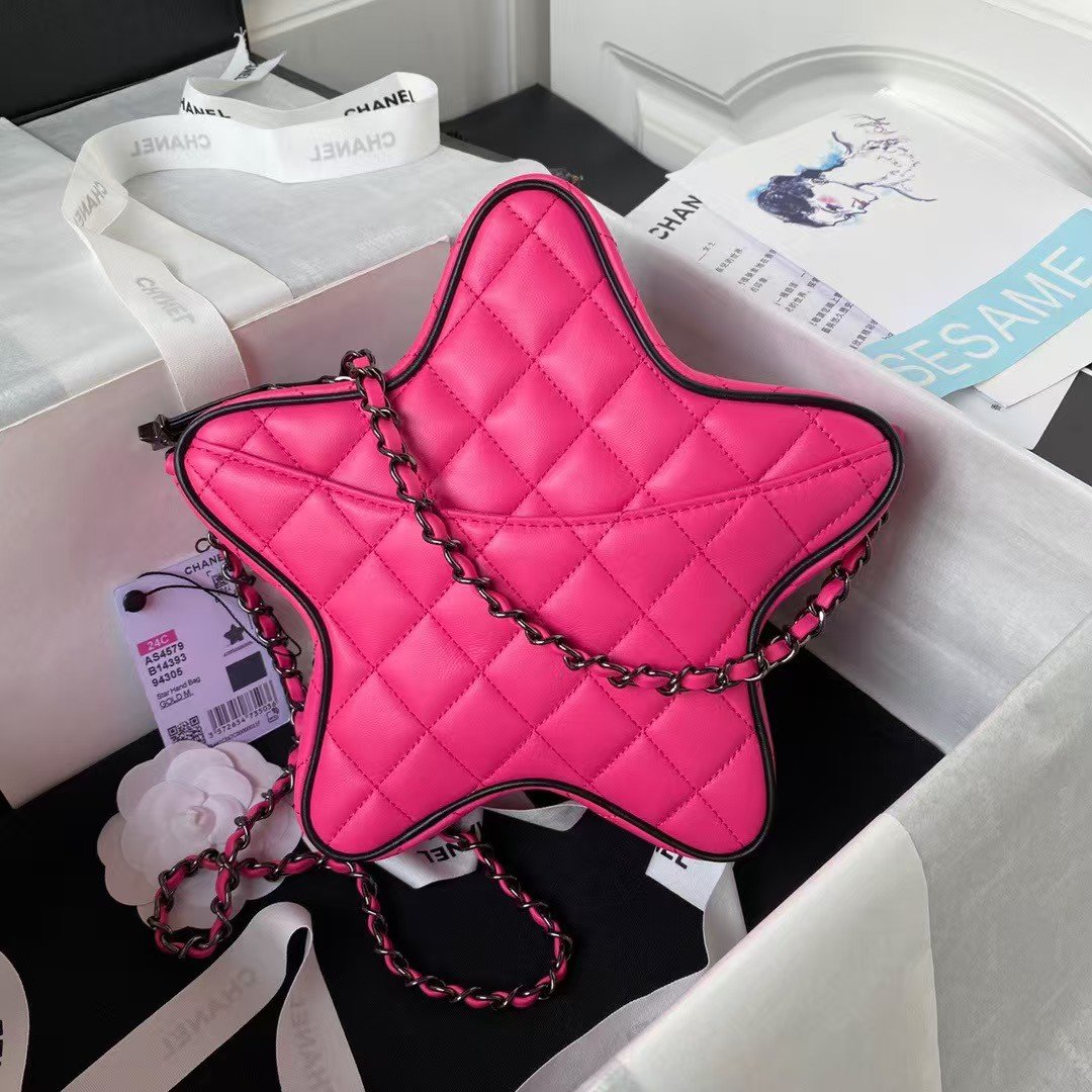 This Chanel CC Star bag is in fuchsia satin fabric with black tone metal hardware and black leather trimming. It features an exterior back slip pocket, dual zip top closure and an interwoven black metal chain link and pink satin leather shoulder strap.