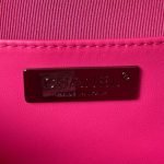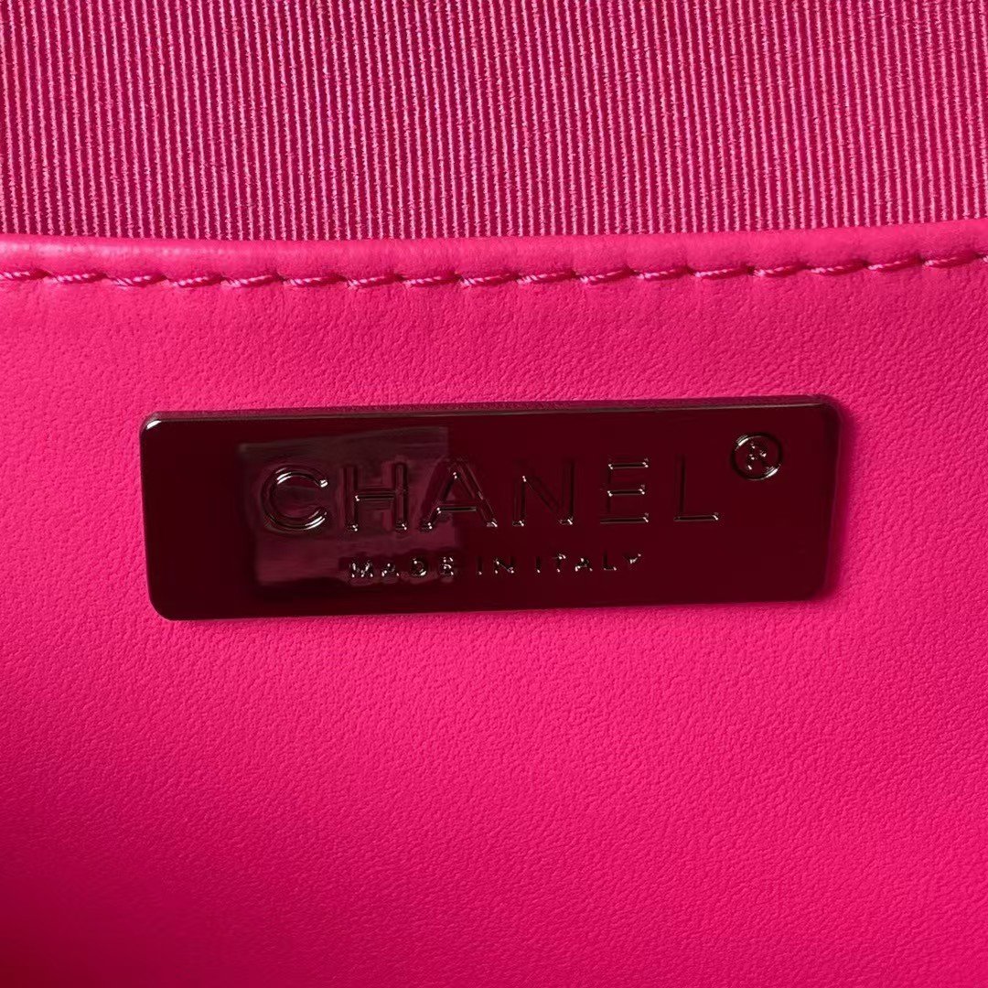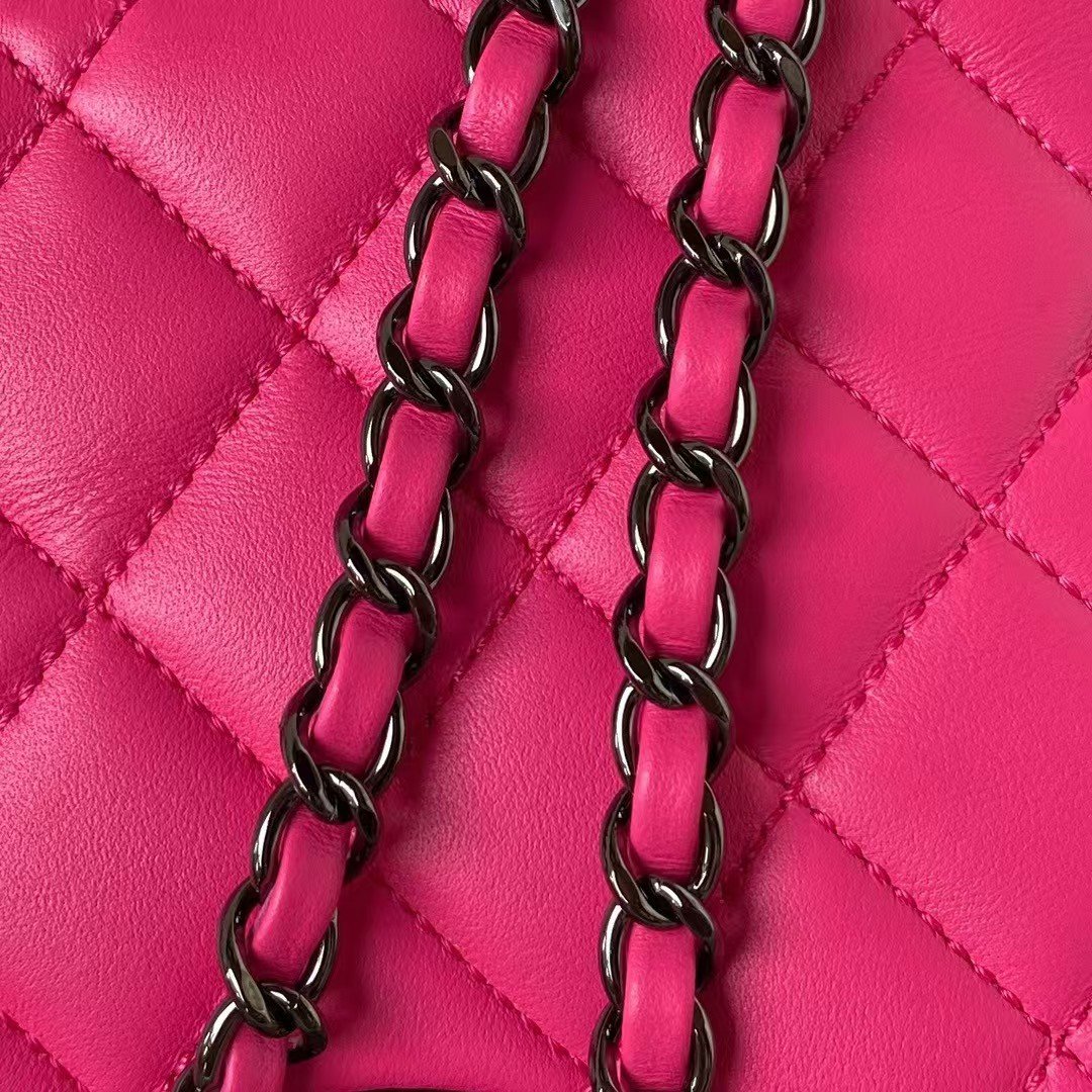 The interior is lined in fuchsia grossgrain canvas and black leather with two open slip pockets on each wall.