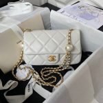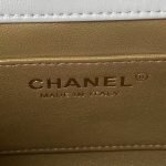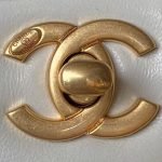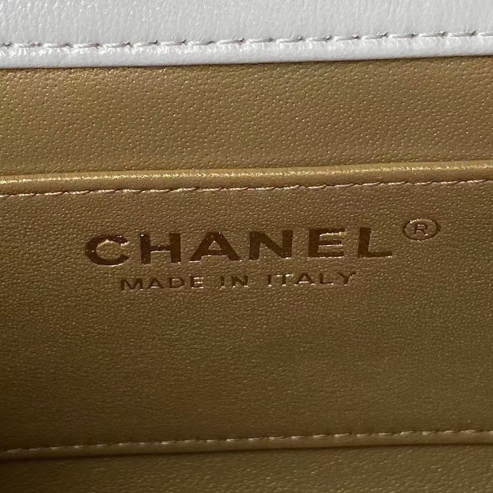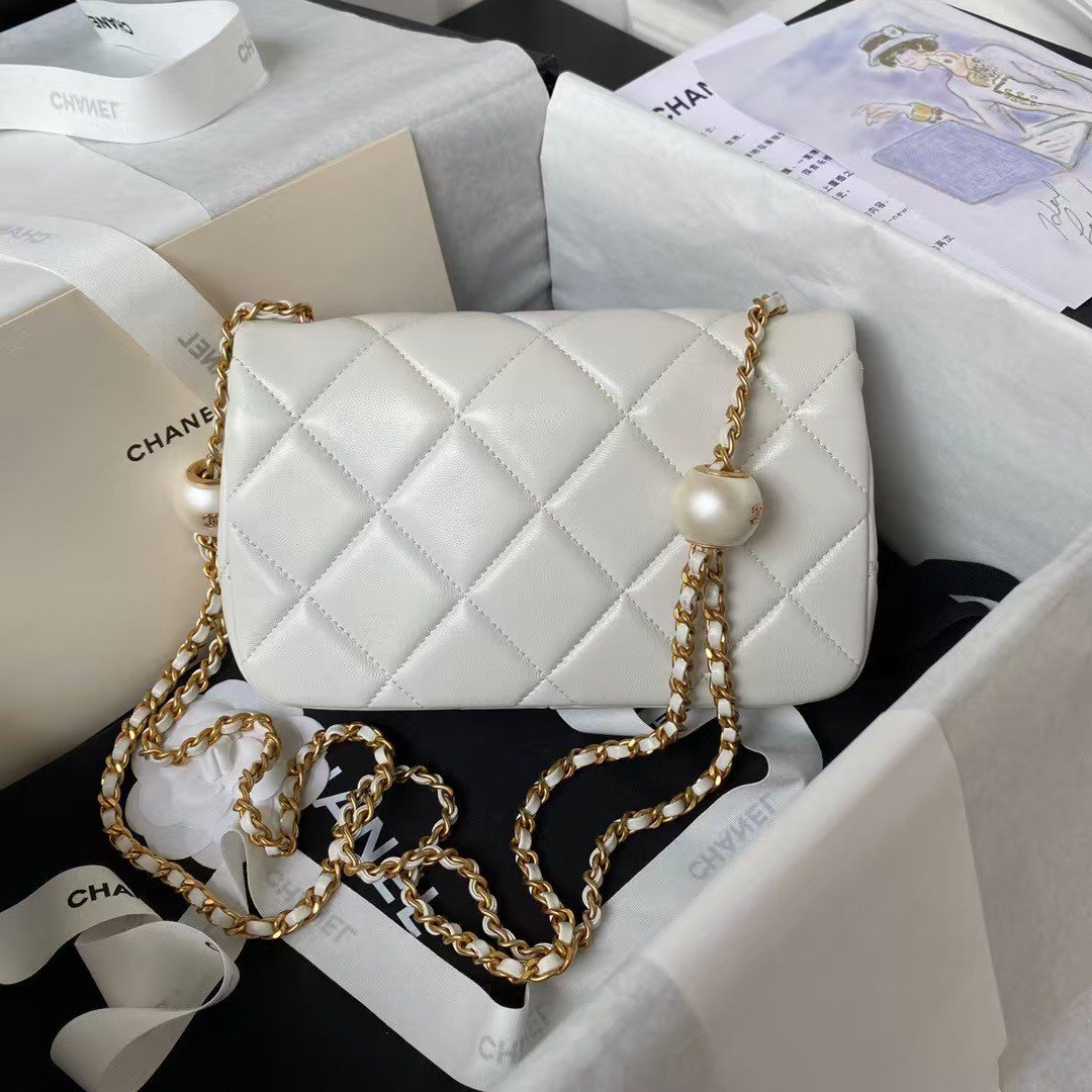 This Chanel Small Flap Bag is made of white lambskin with antique gold hardware, front flap closed with signature CC turnlock clasp, tone-on-tone stitching, adjustable antique gold interwoven chain links and white leather shoulder strap with “pearl” ball attachment.