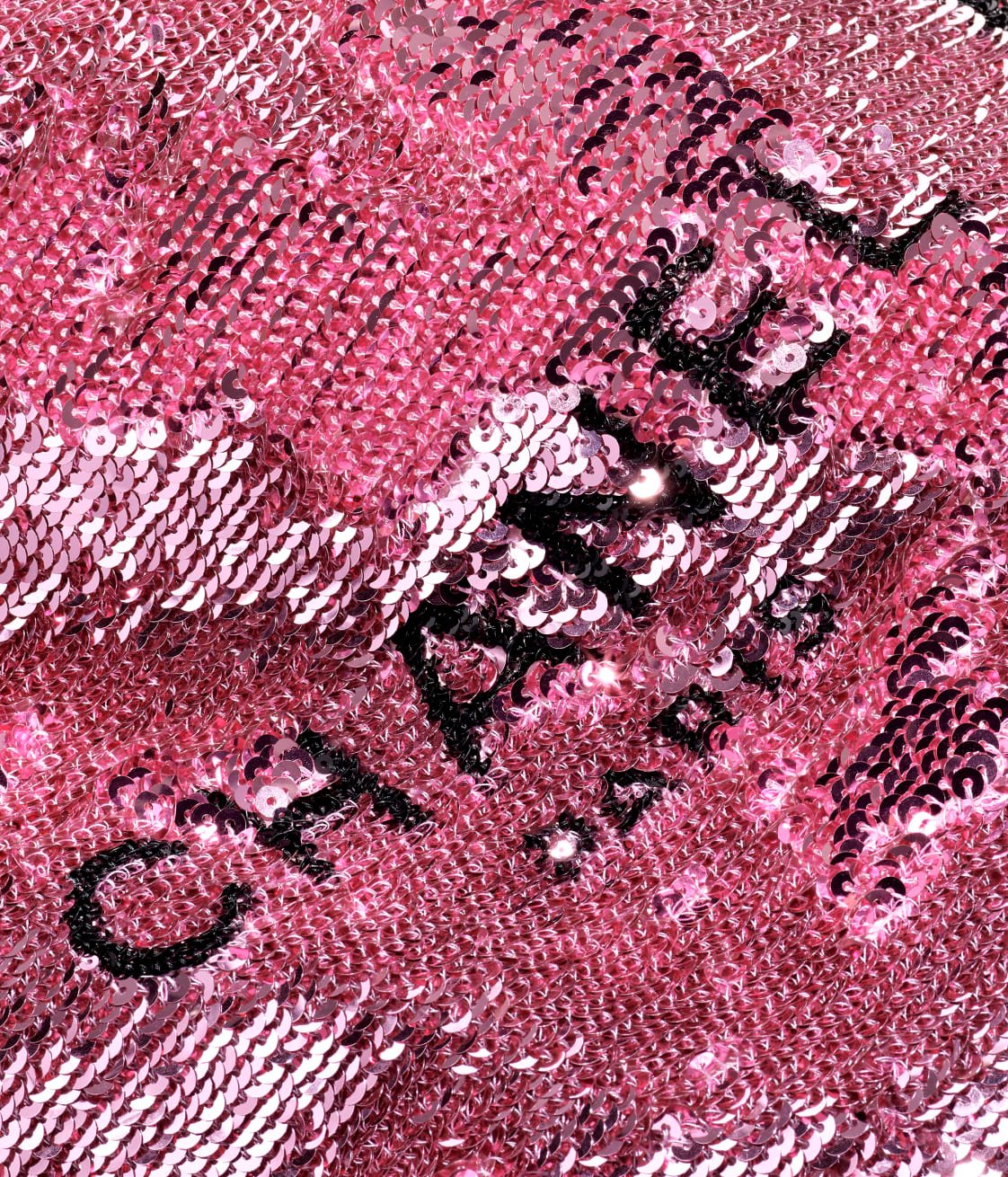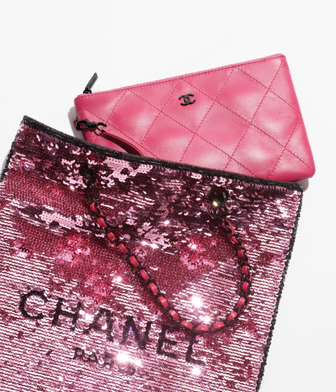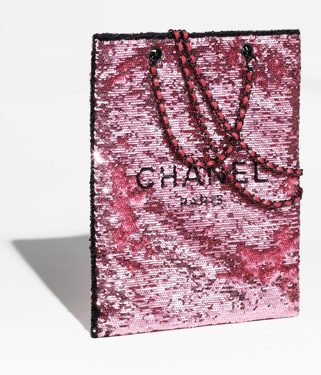 This shopping bag is crafted from dark pink sequins and ribbed satin and leather with black hardware, tonal stitching, a removable pouch inside, interwoven black metal chain links and dark pink leather shoulder strap.