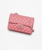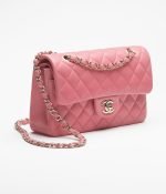 This small classic double flap bag is crafted in pink lambskin with gold hardware, featuring the signature CC turnlock closure on the front flap, a half-moon back pocket, and an adjustable gold interwoven chain link and pink leather shoulder strap.