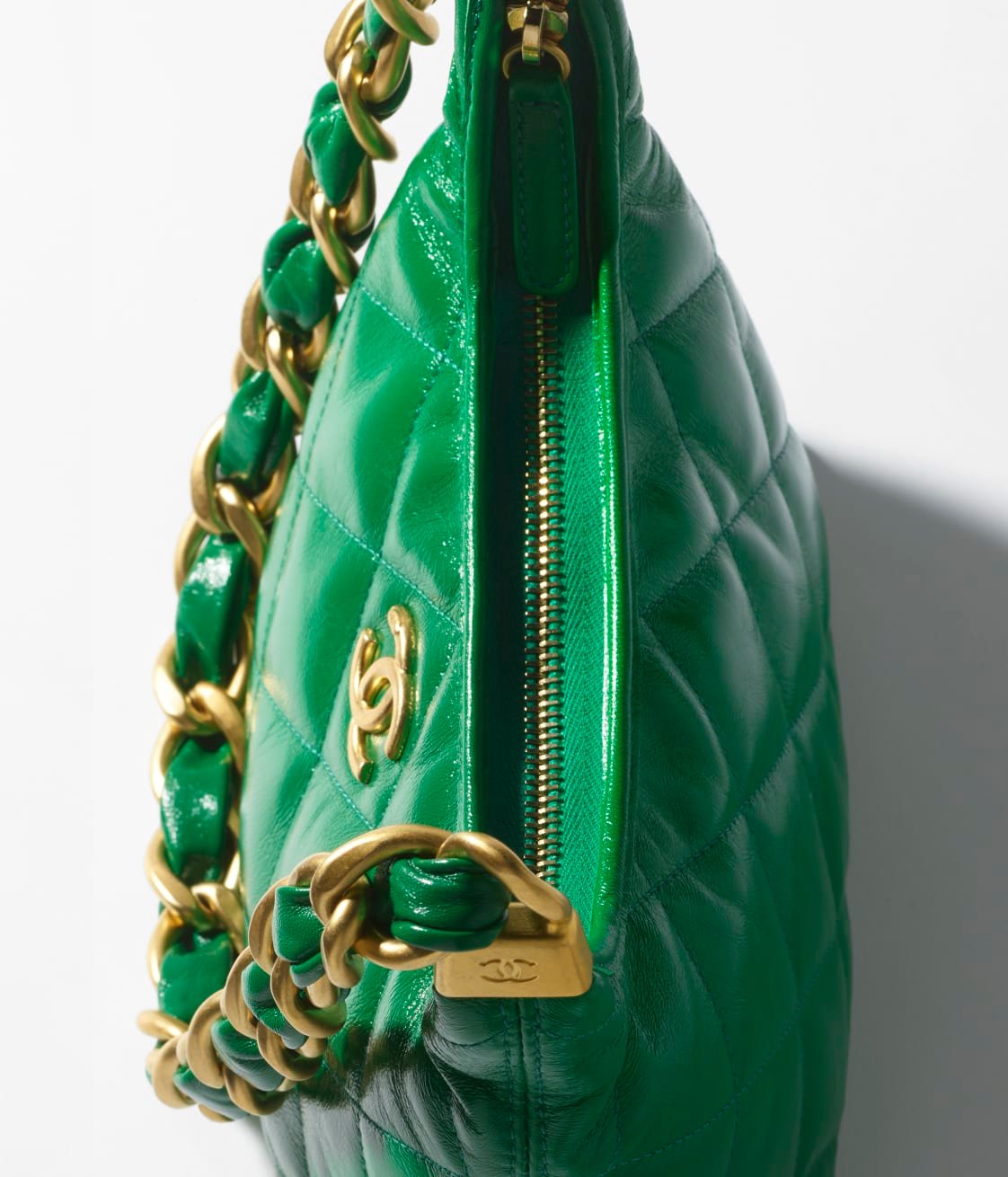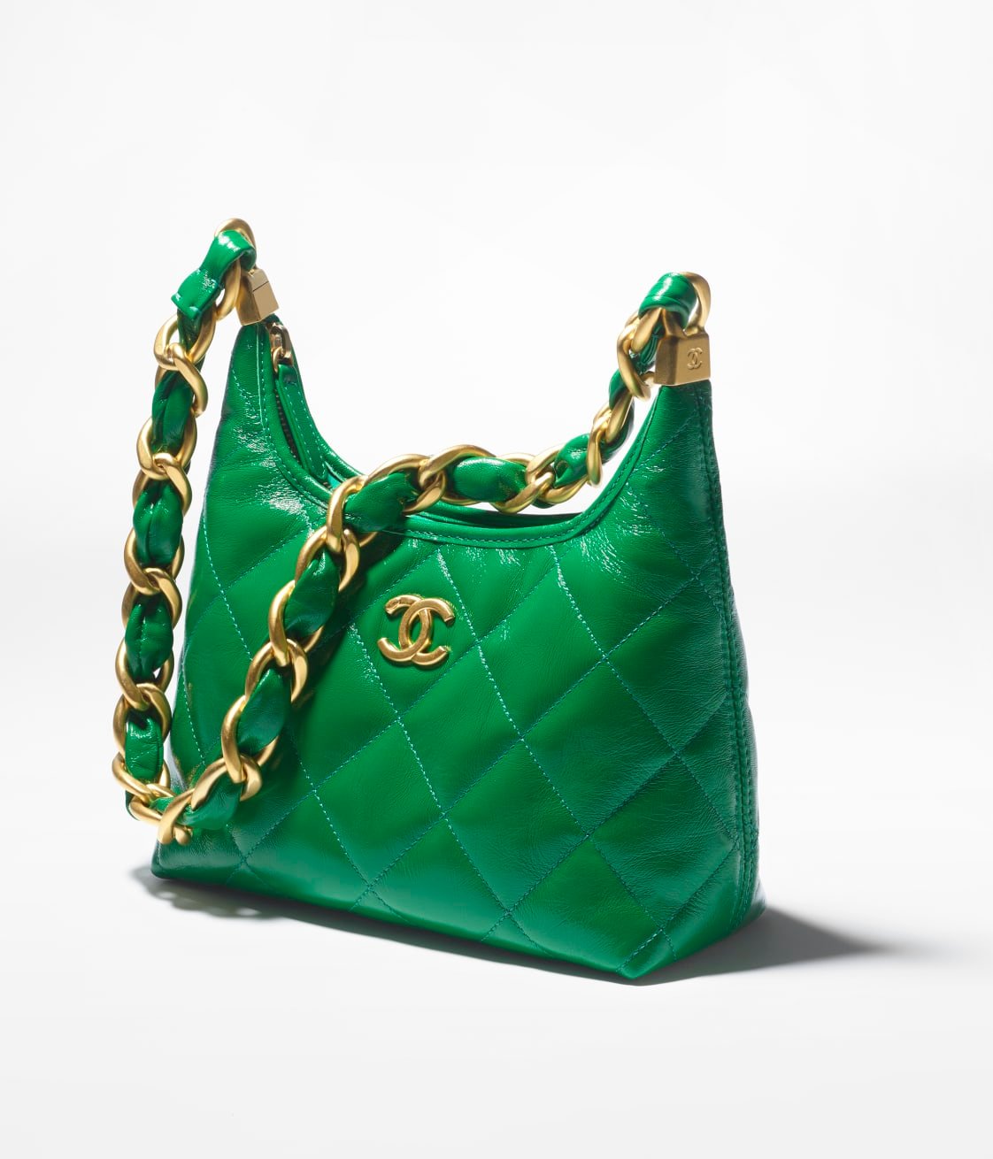 This Chanel Green Quilted Shiny Crinkled Calfskin Small Hobo Bag features CC logo, shiny crinkled calfskin leather with a beautiful luxurious feel, distressed/antique gold tone hardware. Lined in fabric. This bag is perfect for everyday use.