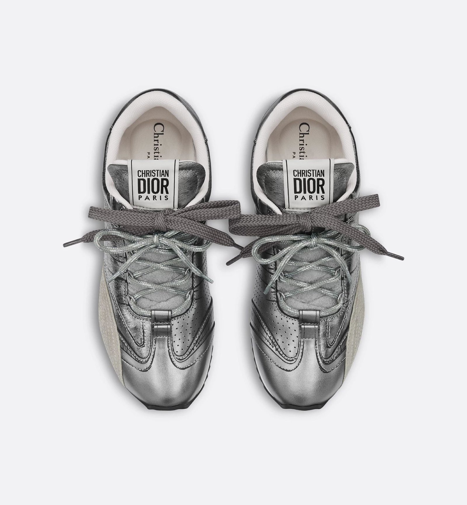 New for Summer 2025, the D-Sketch sneaker reflects a hallmark retro aesthetic. Combining silver-tone crinkled lambskin and laminated calfskin, it features printed markings inspired by the production stages of shoemaking, panels in beige suede calfskin and double lacing. The handwritten Christian Dior Paris signature appears on the sides, while a Christian Dior Paris panel and tag adorn the heel counter and tongue. Complete with a thin sole in two-tone rubber, the sneaker will lend a couture touch to any casual look.
