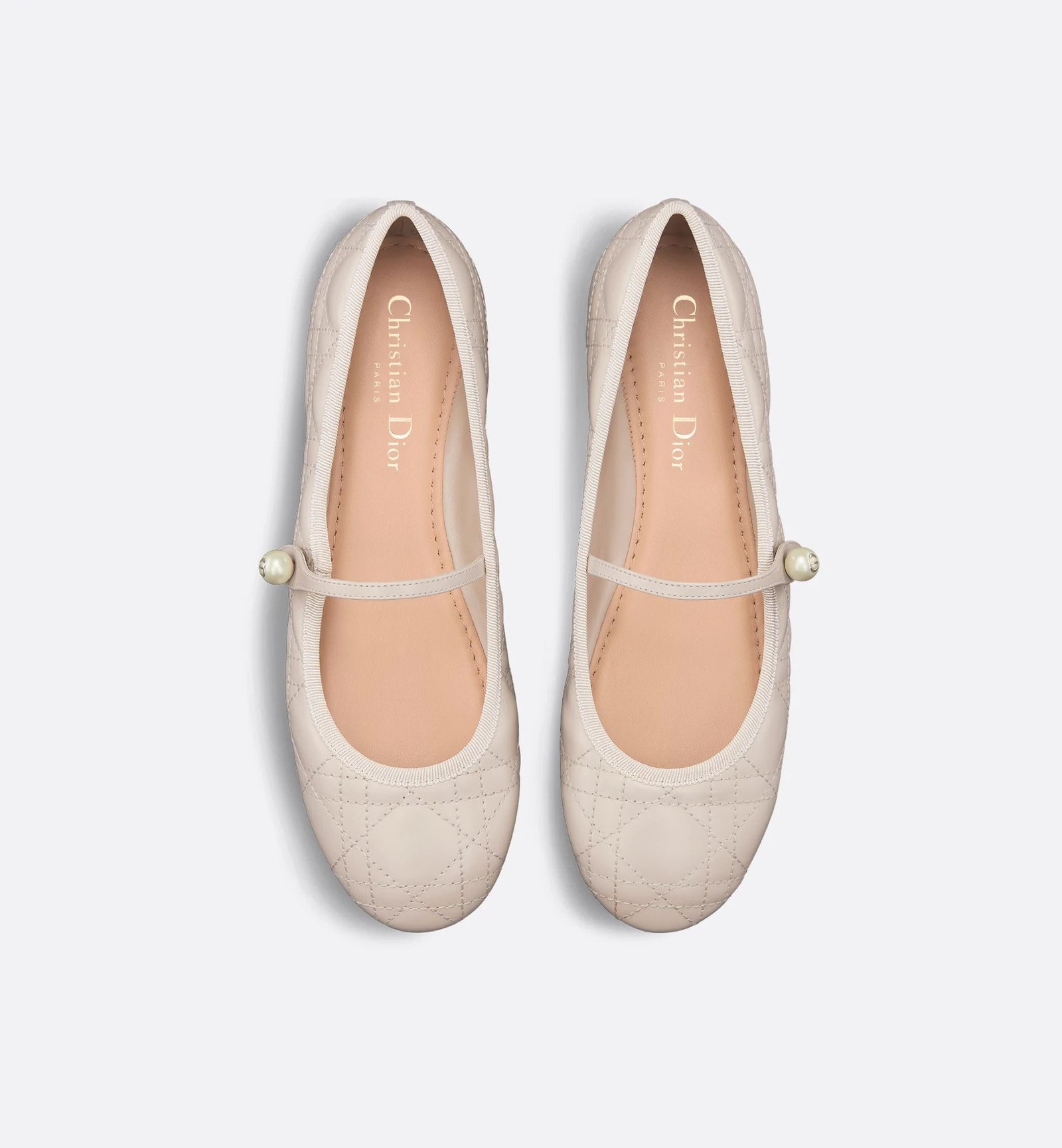 The Dior Ballet flat revisits the Mary Jane with elements of House couture. Crafted in light biscuit quilted calfskin with the Cannage motif, it is distinguished by a leather strap with elastic and a white CD resin pearl inspired by the iconic Dior Tribales earrings. Featuring a padded leather insole, the supple, comfortable ballet flat will add the finishing touch to any of the season’s looks.