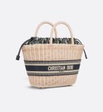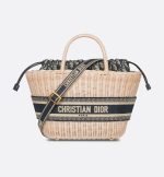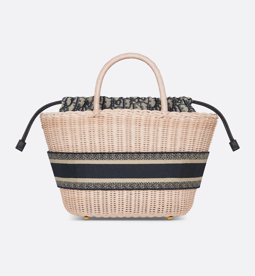 The hat basket bag stands out with its elegant silhouette combining functionality and refinement. A testament to House savoir-faire, the bag is hand-woven using artisanal techniques in natural wicker. The style features wicker top handles and a blue Dior Oblique jacquard interior drawstring pouch. The Christian Dior Paris signature adorns the front. The spacious bag is completed by an adjustable and removable embroidered shoulder strap that allows it to be carried by hand, worn over the shoulder or crossbody.