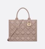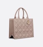 Maria Grazia Chiuri’s hallmark Dior Book Tote offers an original take on elegance. Crafted in warm taupe calfskin, the design showcases the Macrocannage motif and is embellished with pale gold-finish metal D.I.O.R charms on one of the handles. The cashmere leather interior reveals a zip pocket and patch pockets, ideal for organizing all the daily essentials. Featuring an adjustable and removable strap, the lightweight and practical medium tote is a prime example of Dior savoir-faire and may be carried by hand or worn over the shoulder.