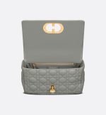 The Dior Caro bag combines modernity with timeless elegance. The silhouette is crafted in stone gray supple calfskin with Cannage topstitching. The supple bag features a flap adorned with an antique gold-finish metal CD twist clasp, inspired by the seal of a Christian Dior perfume bottle. The detachable chain shoulder strap with CD signature links allows the medium bag to be carried by hand or worn over the shoulder and may be replaced by one of the House’s wide embroidered straps for day or evening attire wear.