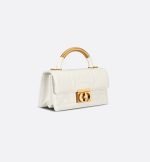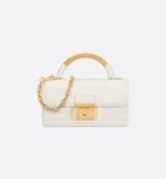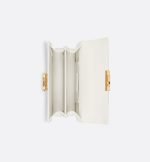 New for Fall 2024, the Dior Ange bag embodies the new House line with a resolutely modern and elegant aesthetic. Constructed in latte calfskin with Macrocannage stitching, it is distinguished by its structured top handle in antique gold-finish metal engraved with the Christian Dior Paris signature and its flap with a CD clasp embellished with a resin pearl. The gusseted silhouette reveals two spacious compartments and a slip pocket to hold all the essentials. Completed by an adjustable and removable CD link chain in gold-finish metal accented by resin pearls, the miniature refined bag can be carried by hand, worn over the shoulder or crossbody.