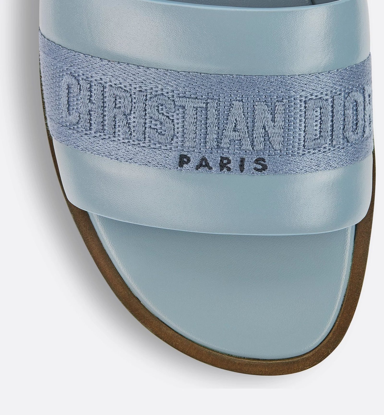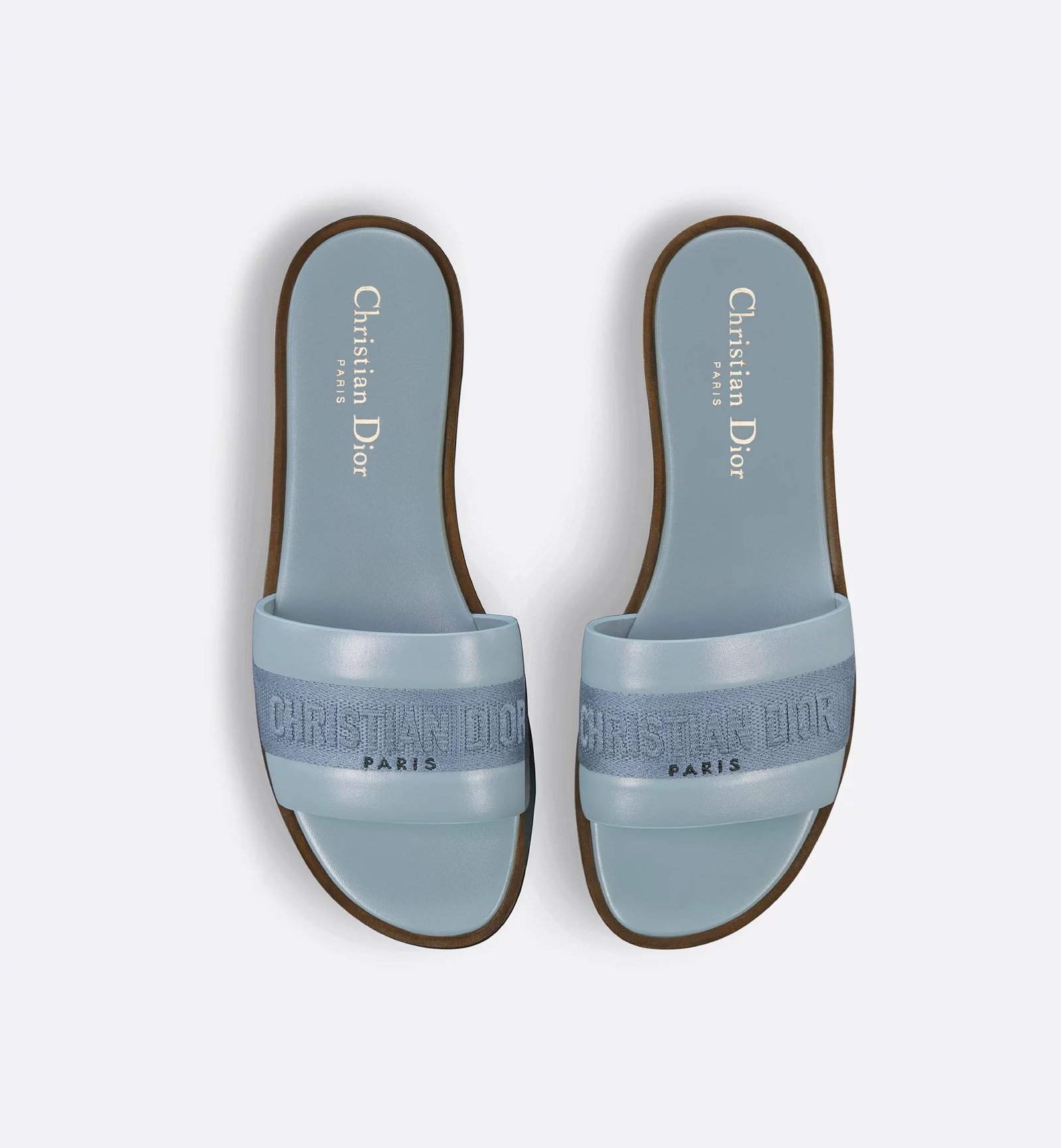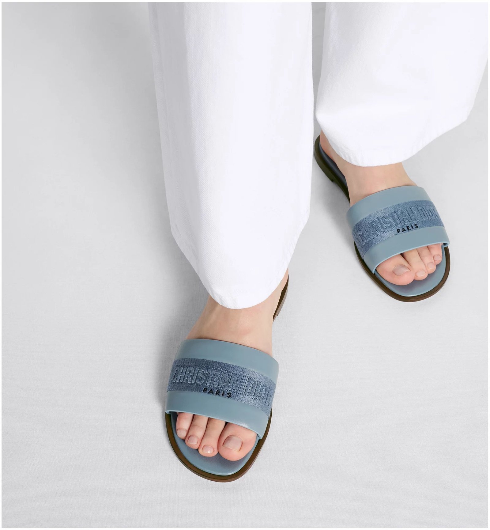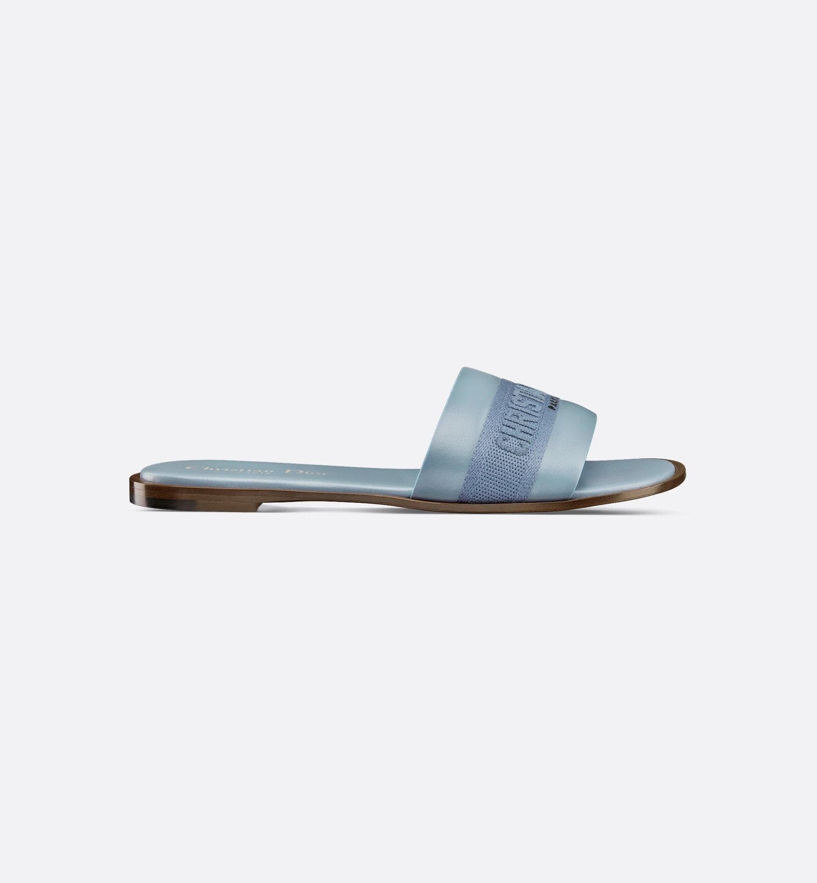 The Dway slide revisits a timeless and emblematic silhouette. The upper in pastel blue calfskin and cotton embroidered with the Christian Dior Paris signature instantly stands out, while the padded leather insole offers ultimate comfort. Its streamlined design allows it to be easily slipped on to complete a laid-back outfit.