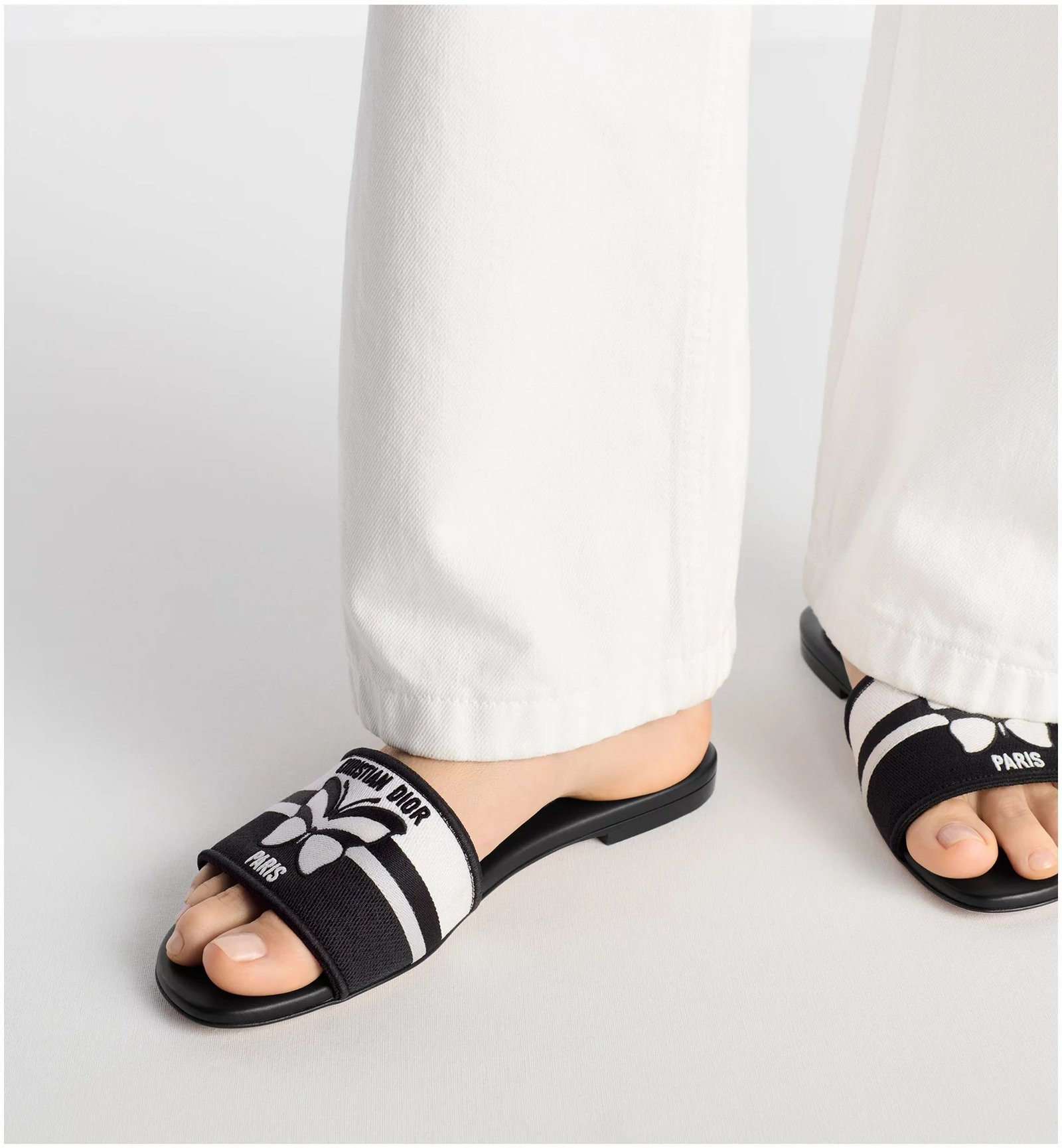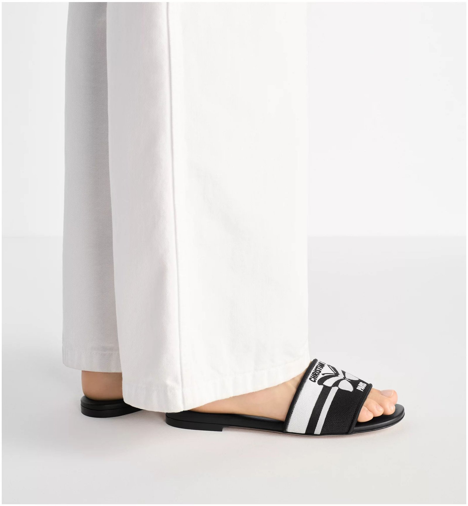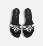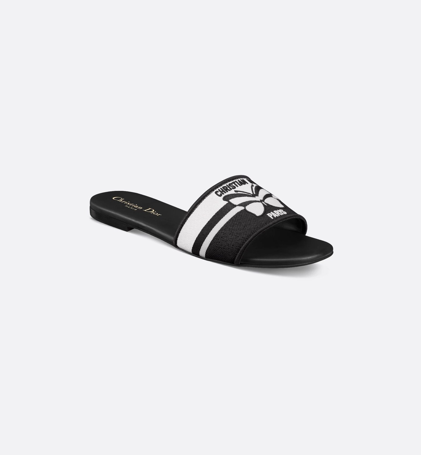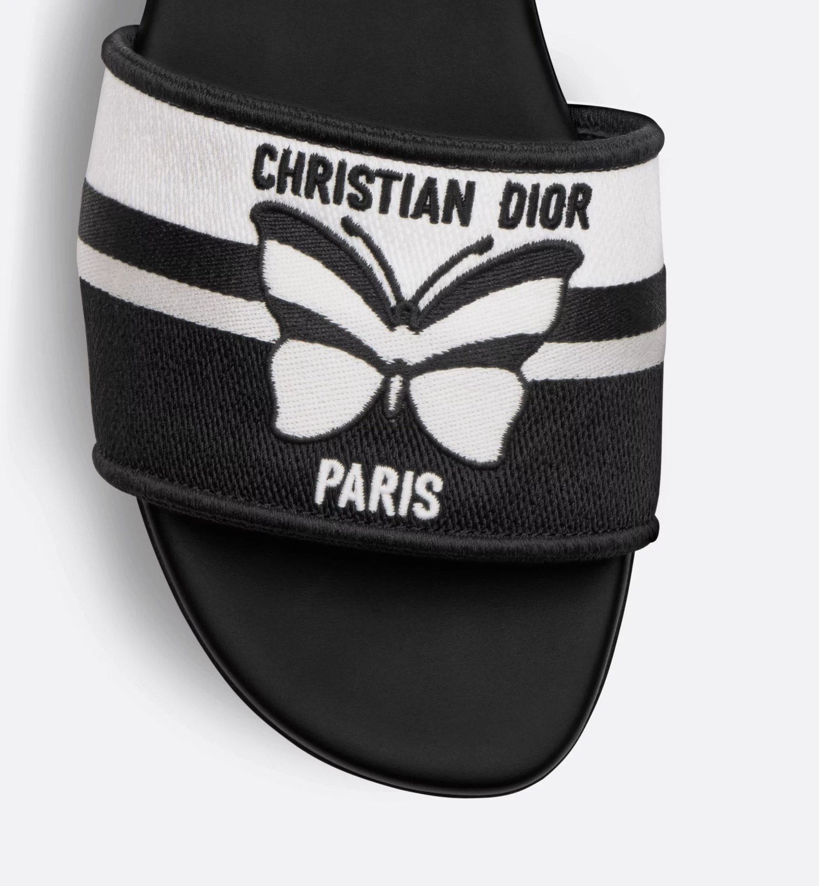 The Dway slide is an emblematic and timeless silhouette. The black and white embroidered cotton upper showcases the Christian Dior Papillon motif, offering a graphic take on the season’s signature theme. Its streamlined design allows the sandal to easily slip on and complete any laid-back attire.