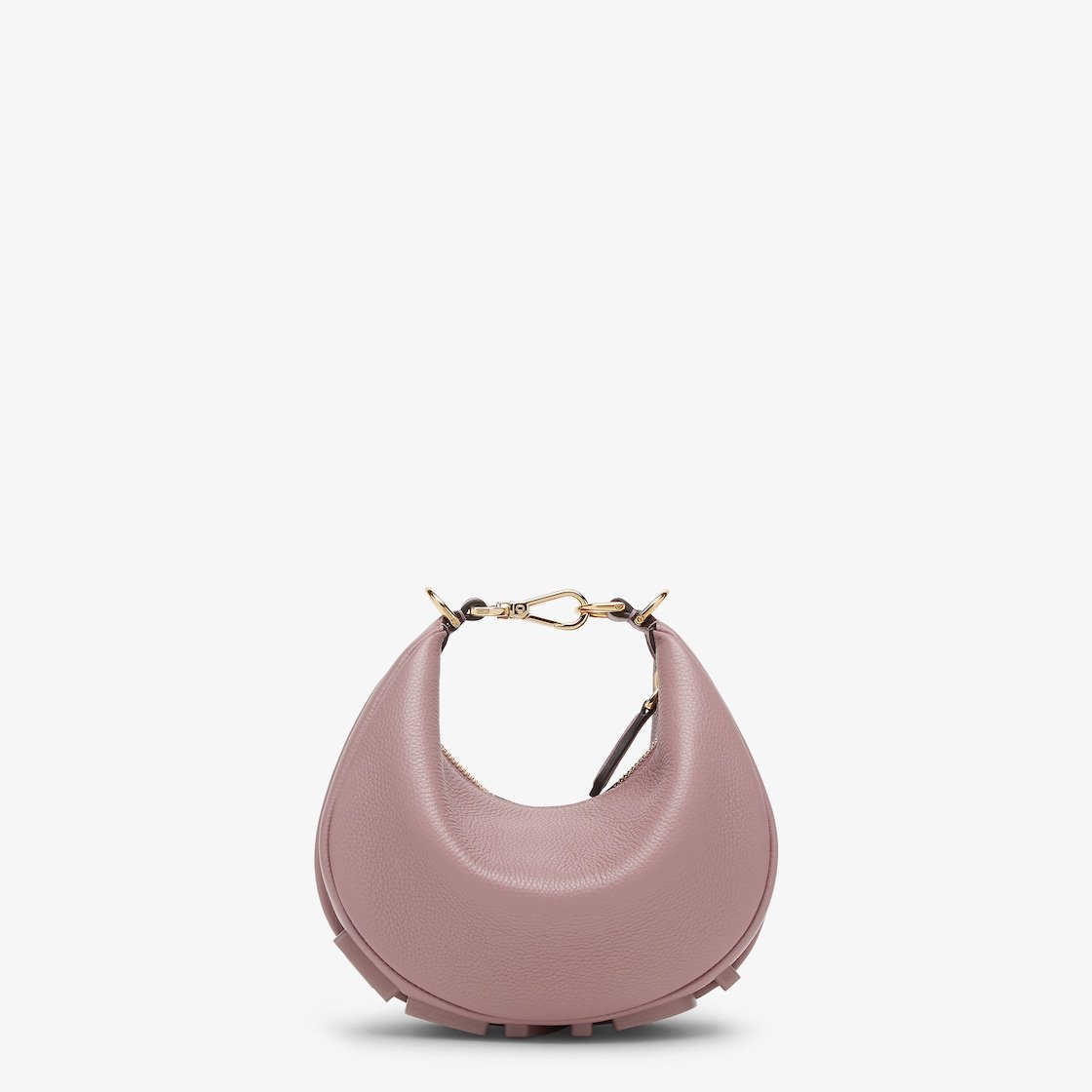 Made of mauve pink full-grain calfskin, decorated with tone-on-tone enamelled FENDI lettering on the base, visible when the bag is worn.