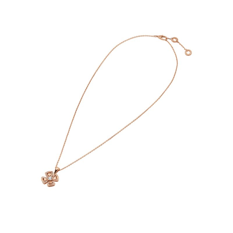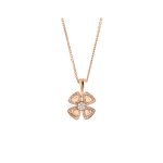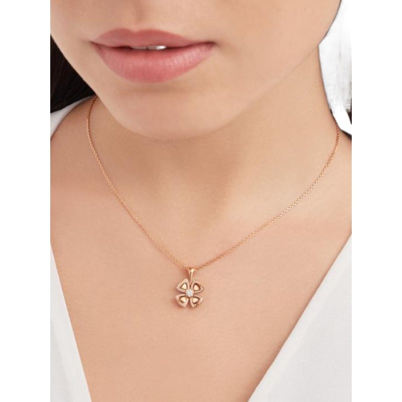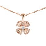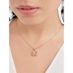 Blooming in the Eternal City of Rome, the Fiorever collection draws its design inspiration from the charming four-petal flower cherished by the Romans as a symbol of happiness and joy. Made up of two words rich in meaning:Fiore (flower in Italian) and forever (eternity in English), Fiorever celebrates the Romans’ love of life with a passionate and stunning design. Bvlgari’s precious classic floral motif is adorned with four diamond-paved hollow petals in rose gold, surrounding a shining central diamond, and blooming a timeless and brilliant light. Fiorever necklace in 18K rose gold, set with a diamond and decorated with pavé diamonds.