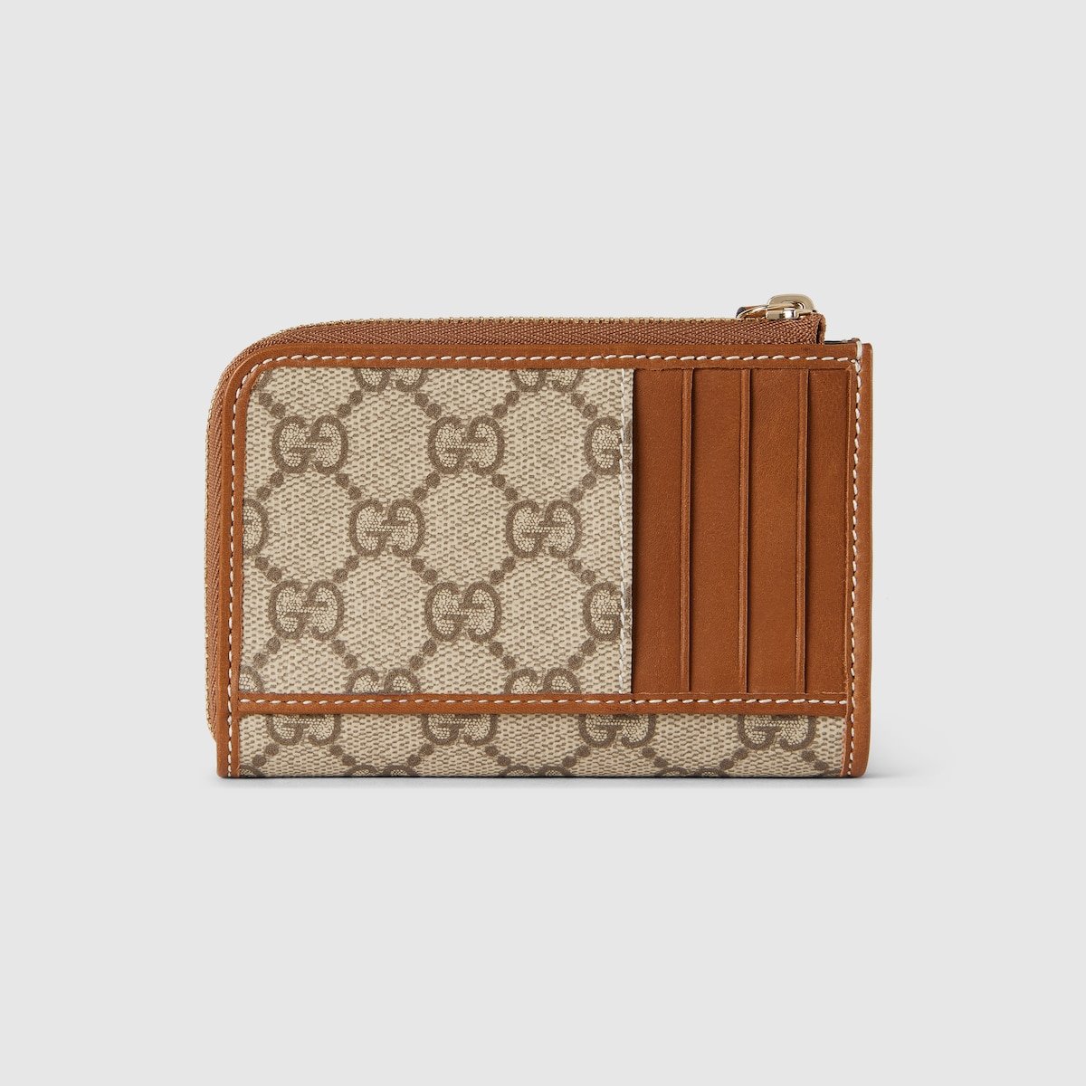 The GG Emblem collection reinterprets signature motifs through creativity and innovative functions , and is envisioned to be cherished for years to come. Introduced in the latest line of small accessories, this beige and dark brown card case is crafted from the new GG Monogram fabric. Featuring an inside coin pocket, the outside features flat pockets and card slots.