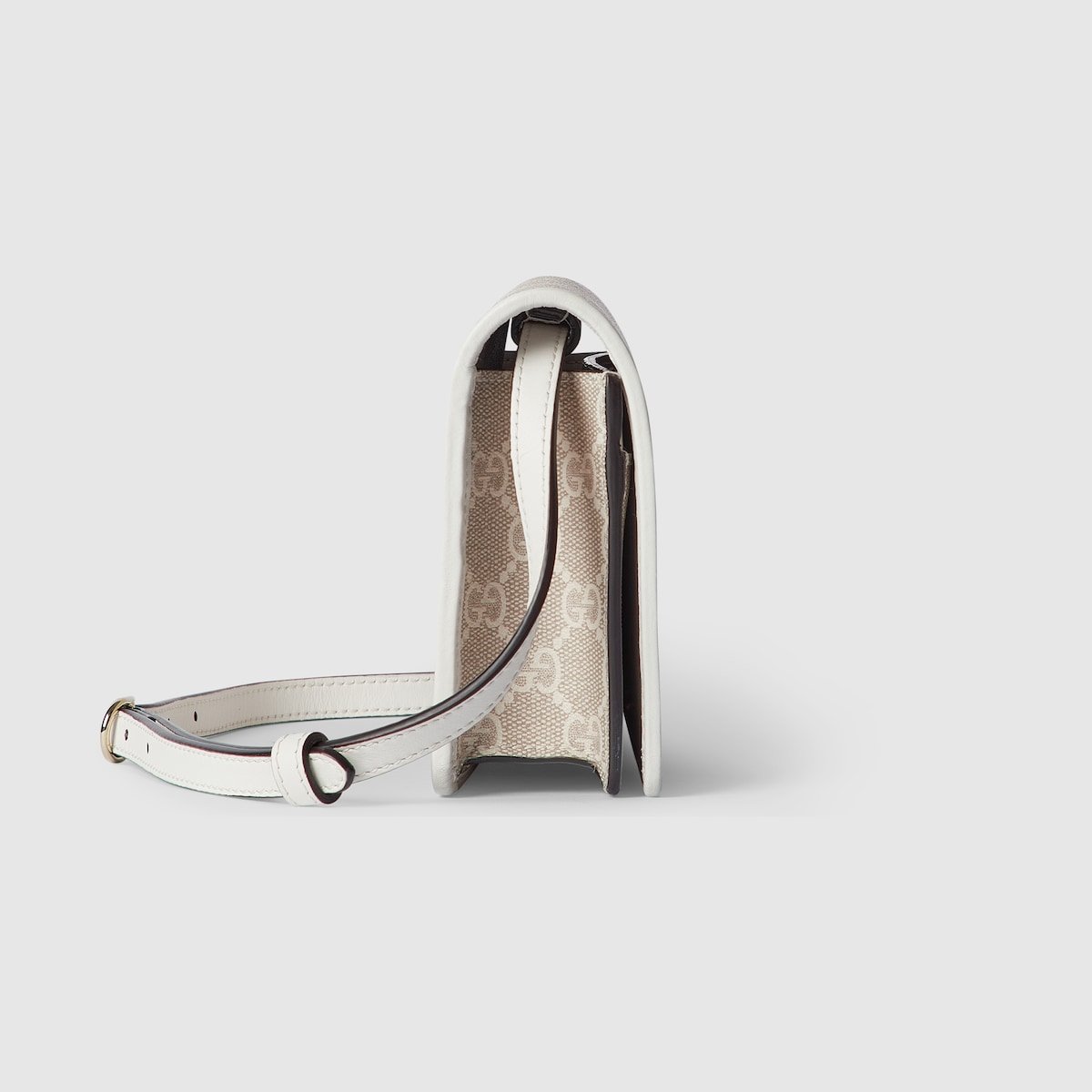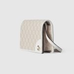 The GG Emblem collection reinterprets signature motifs through creativity and innovative functions, and is envisioned to be cherished for years to come. Introduced in the latest line of small accessories, this beige and white shoulder bag is crafted from the new GG Monogram fabric. Featuring an off white leather trim, the design comes with an embossed Gucci logo.