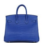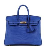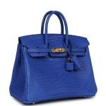 This Birkin is in Bleu RoyalmattePorosuscrocodile leather with gold hardware and has tonal stitching, front strap, two straps with center toggle closure, clochette with lock and two keys and double rolled handles.