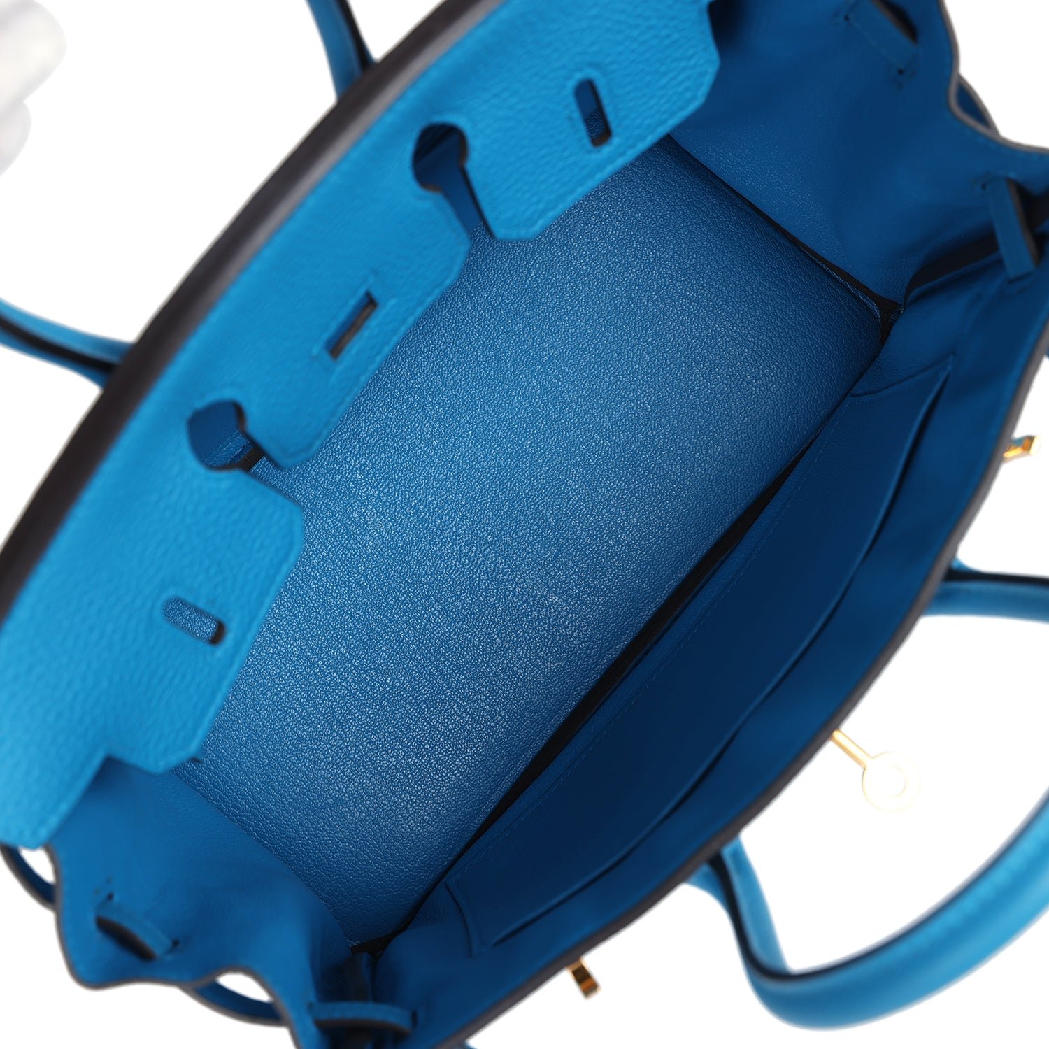 The interior is lined with BleuZanzibar chevre and has one zip pocket with an Hermès engraved zipper pull and an open pocket on the opposite side.
