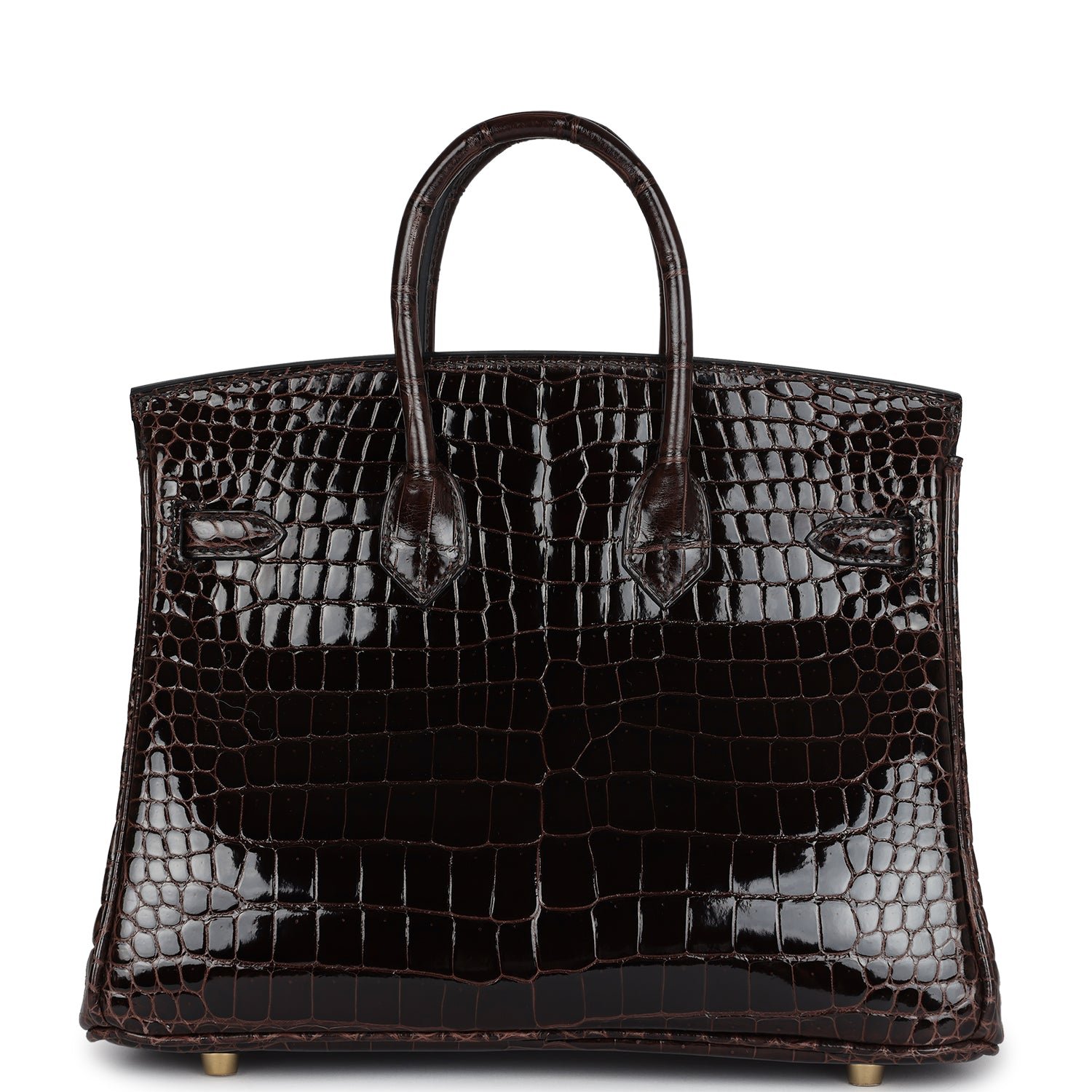 This Birkin is inMacassarshiny porosus crocodile with gold hardware and has tonal stitching,front flap, two straps withcentertoggle closure, clochette with lock and two keys, and double rolled handles.
