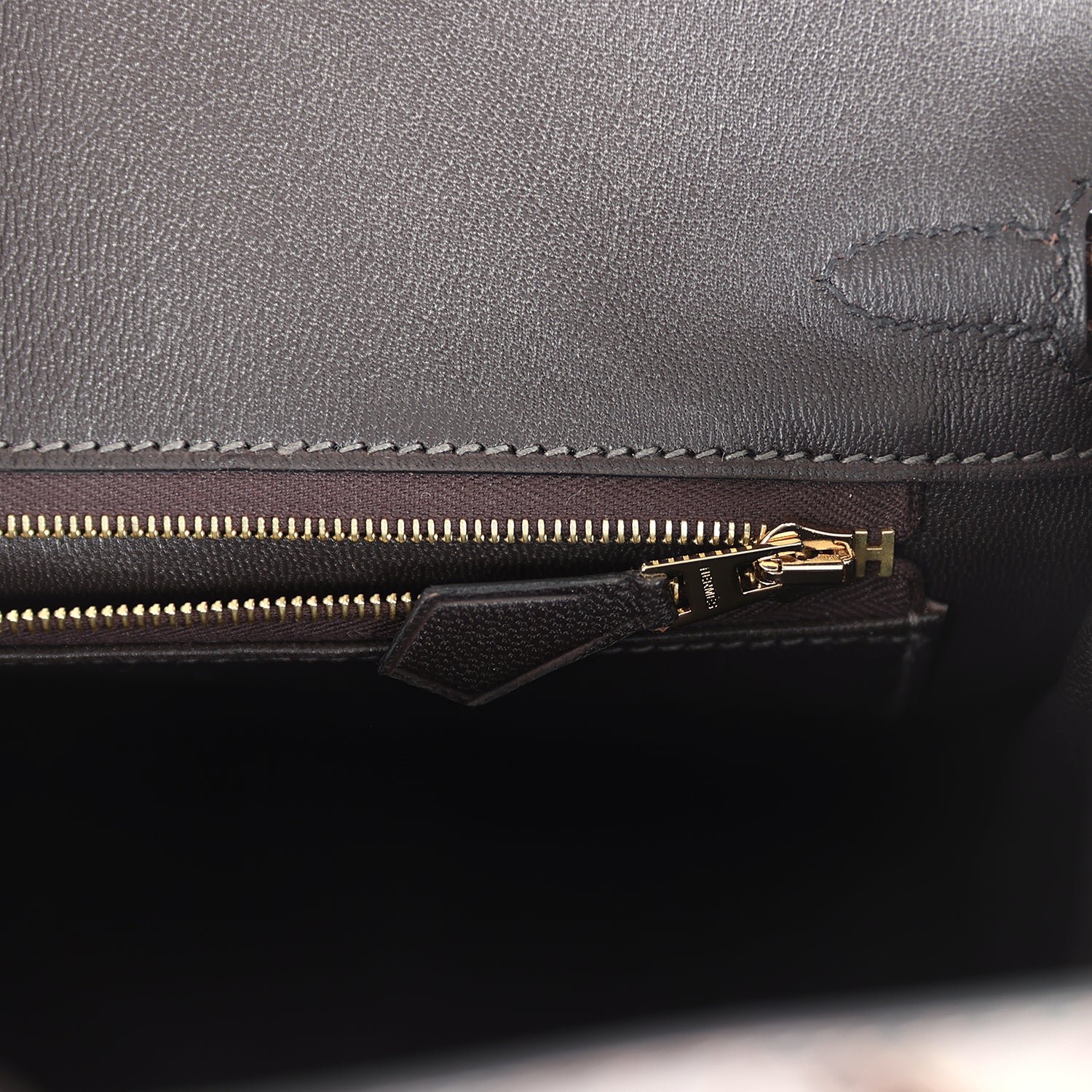 The interior is lined withMacassarchevre and has one zip pocket with an Hermès engraved zipper pull and an open pocket on the opposite side.