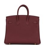 This Birkin is in Rouge H togo leather with gold hardware and has tonal stitching,front flap, two straps withcentertoggle closure, clochette with lock and two keys, and double rolled handles.