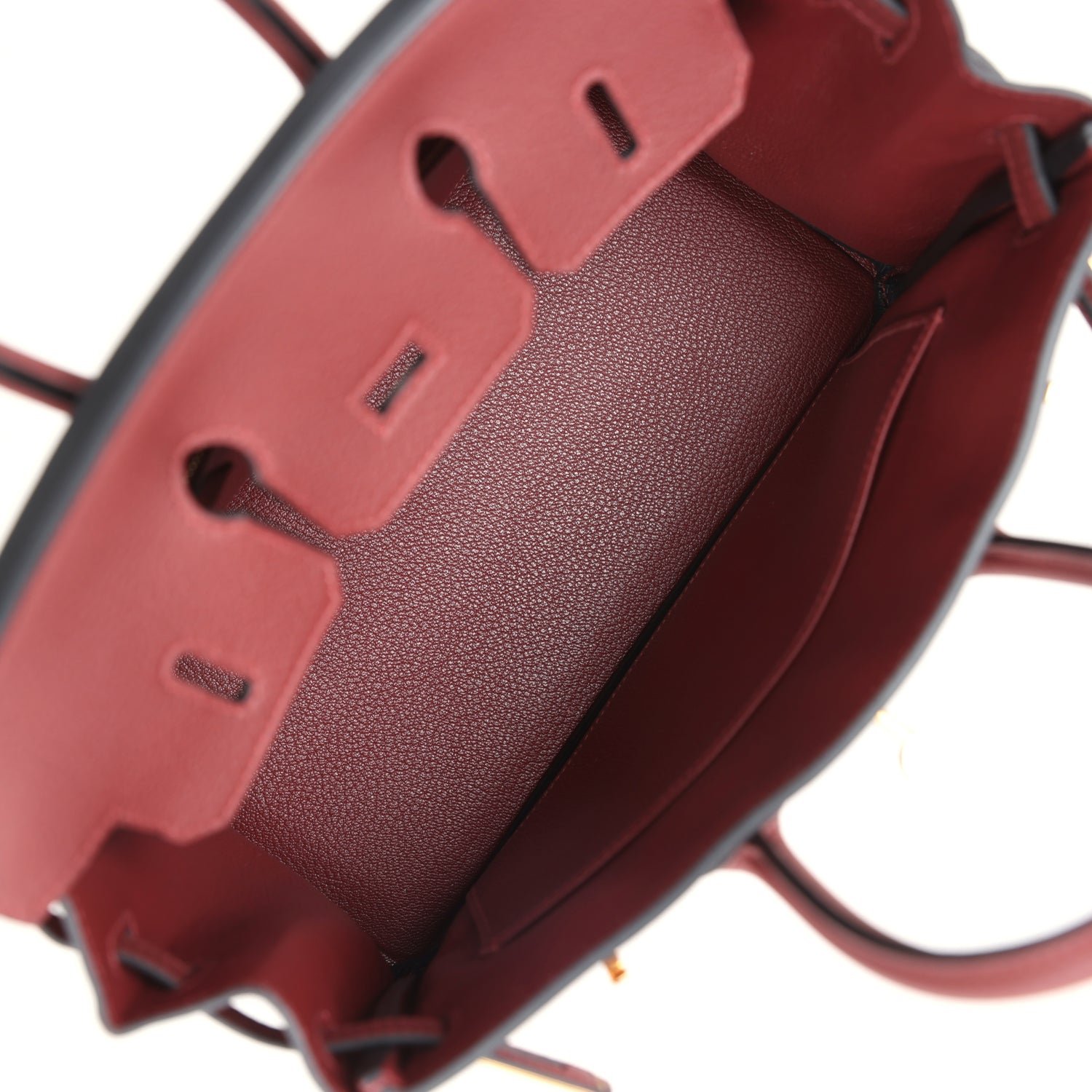 The interior is lined with Rouge H chevre and has one zip pocket with an Hermès engraved zipper pull and an open pocket on the opposite side.