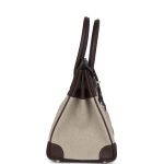 This Birkin is in Bivouac Ficelle canvas and Moka swift leather with palladium hardware and has tonal stitching, front flap, two straps with center toggle closure, clochette with lock and two keys, and double rolled handles.