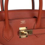 ThisBirkin is in Cuivre Taurillon Novillo leather with gold hardware and has tonal stitching, front flap, two straps with center toggle closure, clochette with lock and two keys, and double rolled handles.