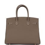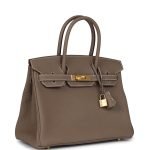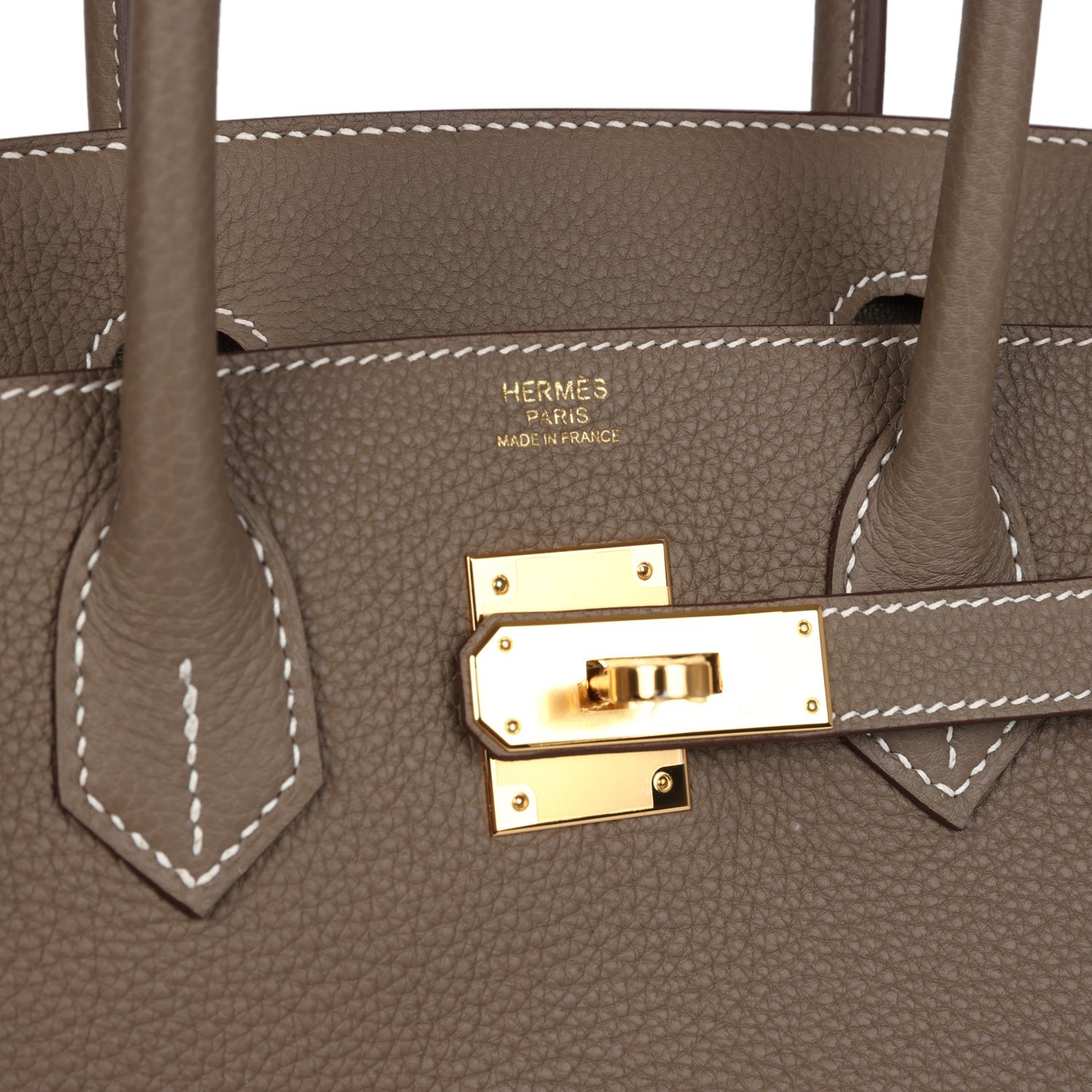 This Birkin is in Etoupe togo leather with gold hardware and has contrast stitching, front flap, two straps with center toggle closure, clochette with lock and two keys and double rolled handles.