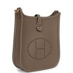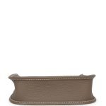 This Evelyne TPM isin Etoupe clemence leather with gold hardware and has contrast stitching, pull tab top closure and a removable canvas and leather shoulder/crossbody strap.