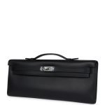 This Hermès Kelly Cut is in Black swift leather with palladium hardware, features tonal stitching, front flap, pull straps that attach to a toggle, and small top handle.