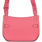 This Jypsiere Mini is in Rose Azalee swift leather with palladium hardware, tonal stitching, single flap, two pull straps, turnlock closure, and a flat wool shoulder strap.