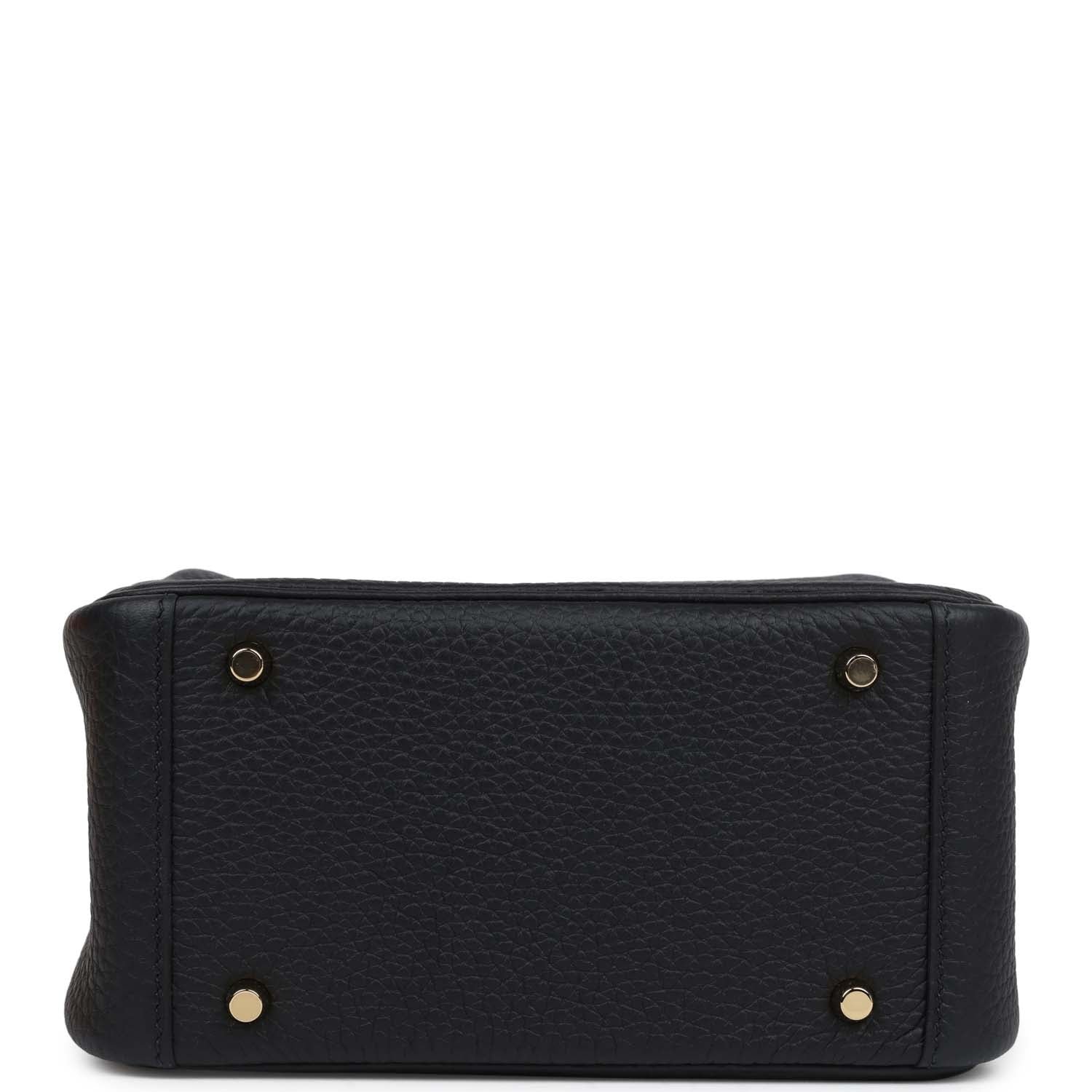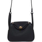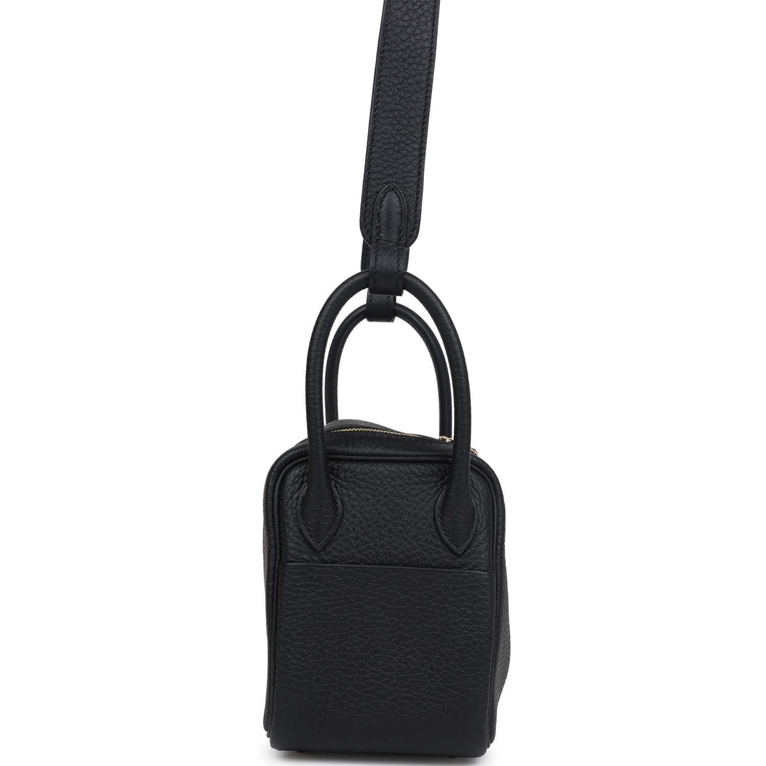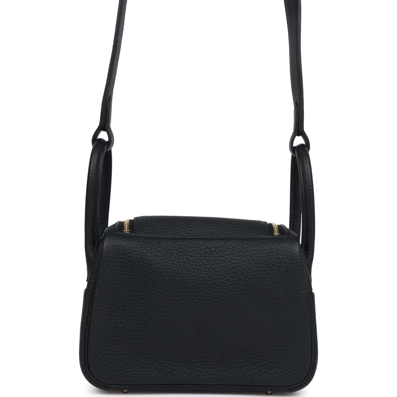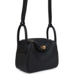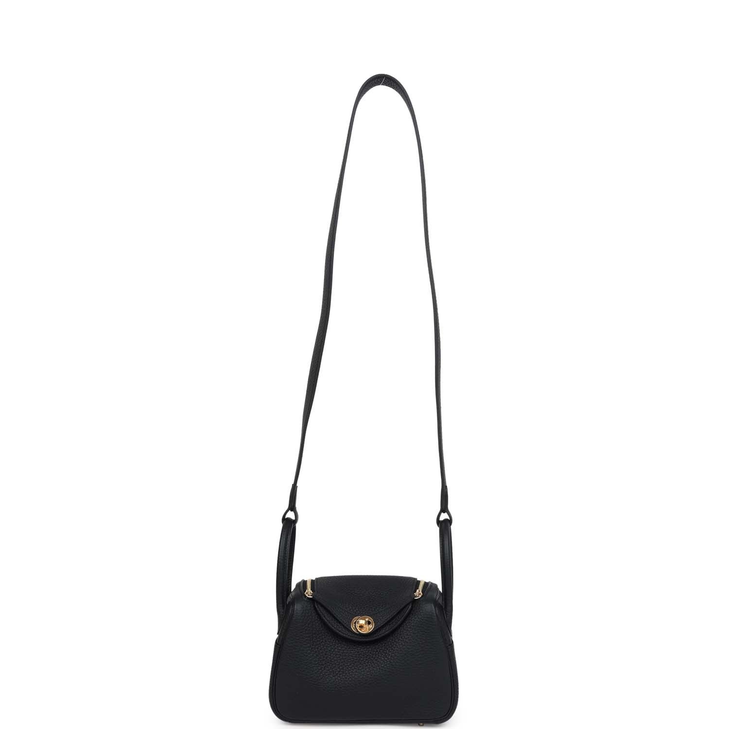 This Mini Lindy is inBlack clemence leather withgold hardware and has tonal stitching, double zipper pulls, front Hermès twist lock, single pocket on each side, two rolled top handles linked by a flat shoulder strap.