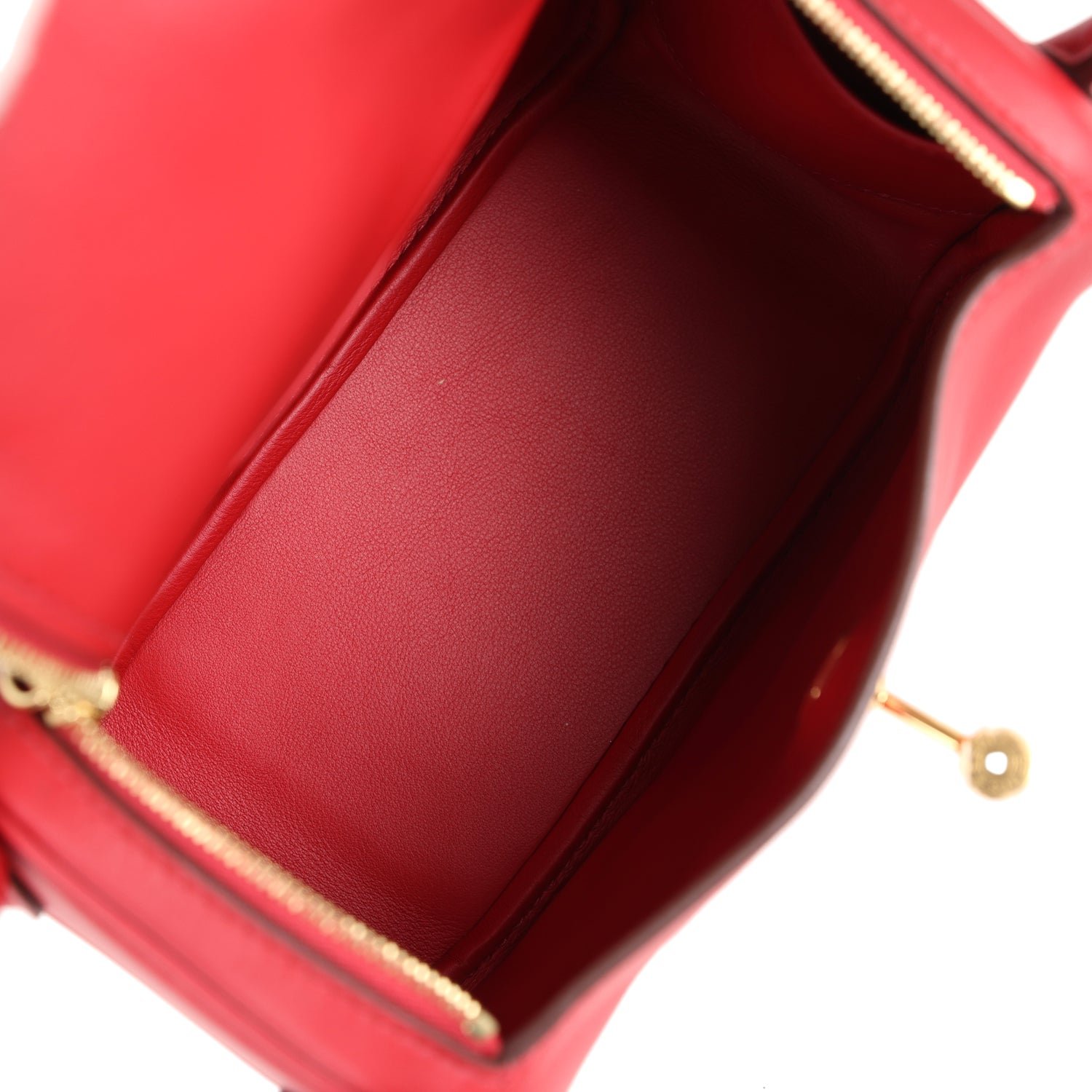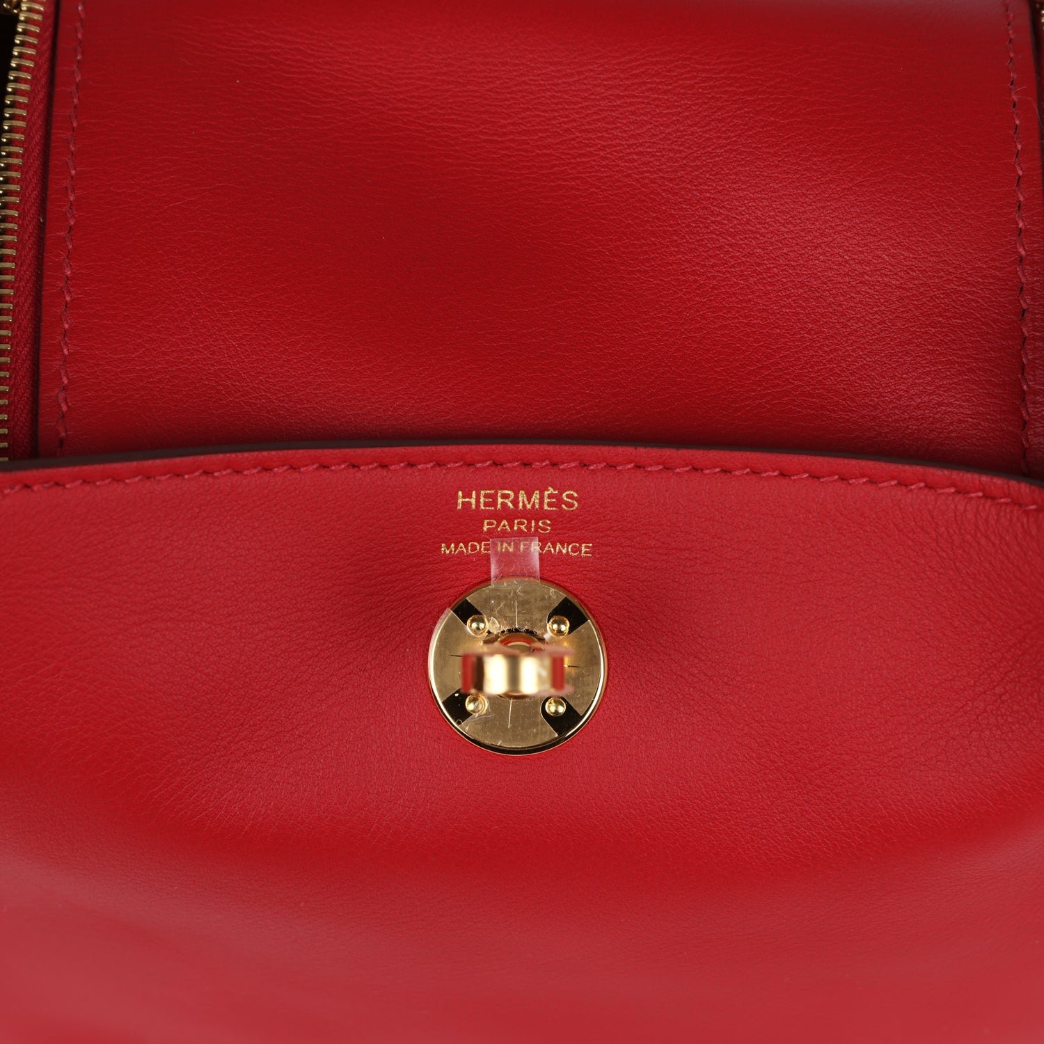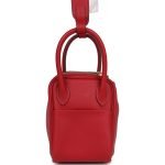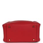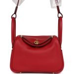This Mini Lindy is in Rouge Casaque swift leather with gold hardware and has tonal stitching, double zipper pulls, front Hermès twist lock, single pocket on each side, two rolled top handles linked by a flat shoulder strap.