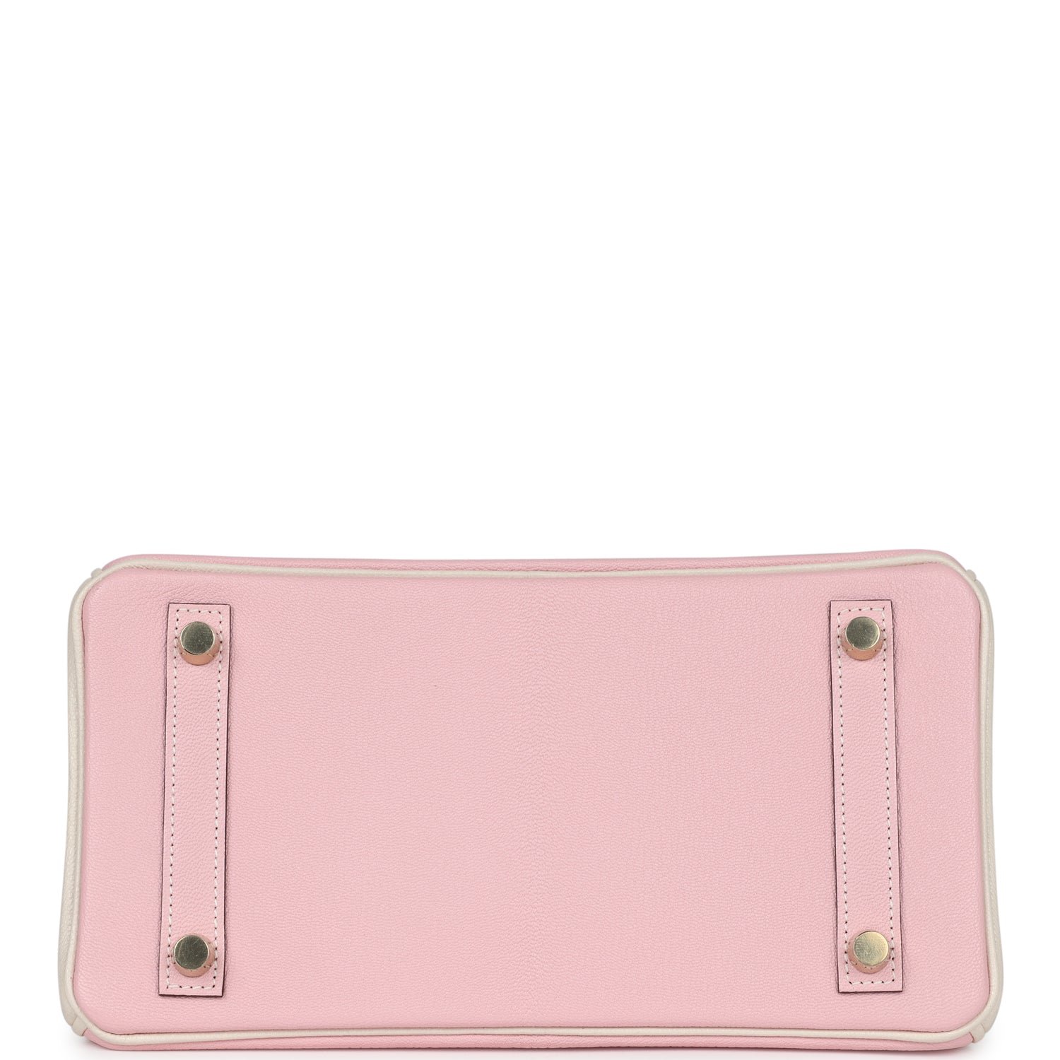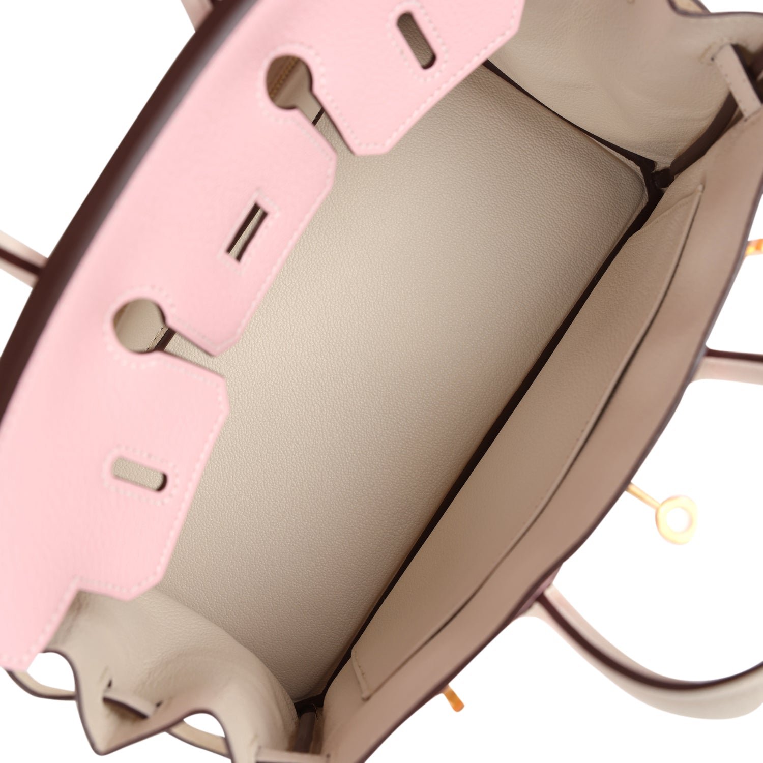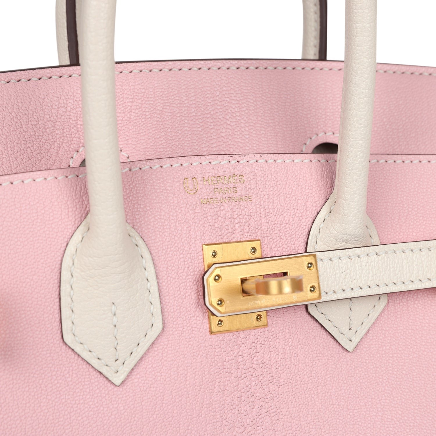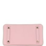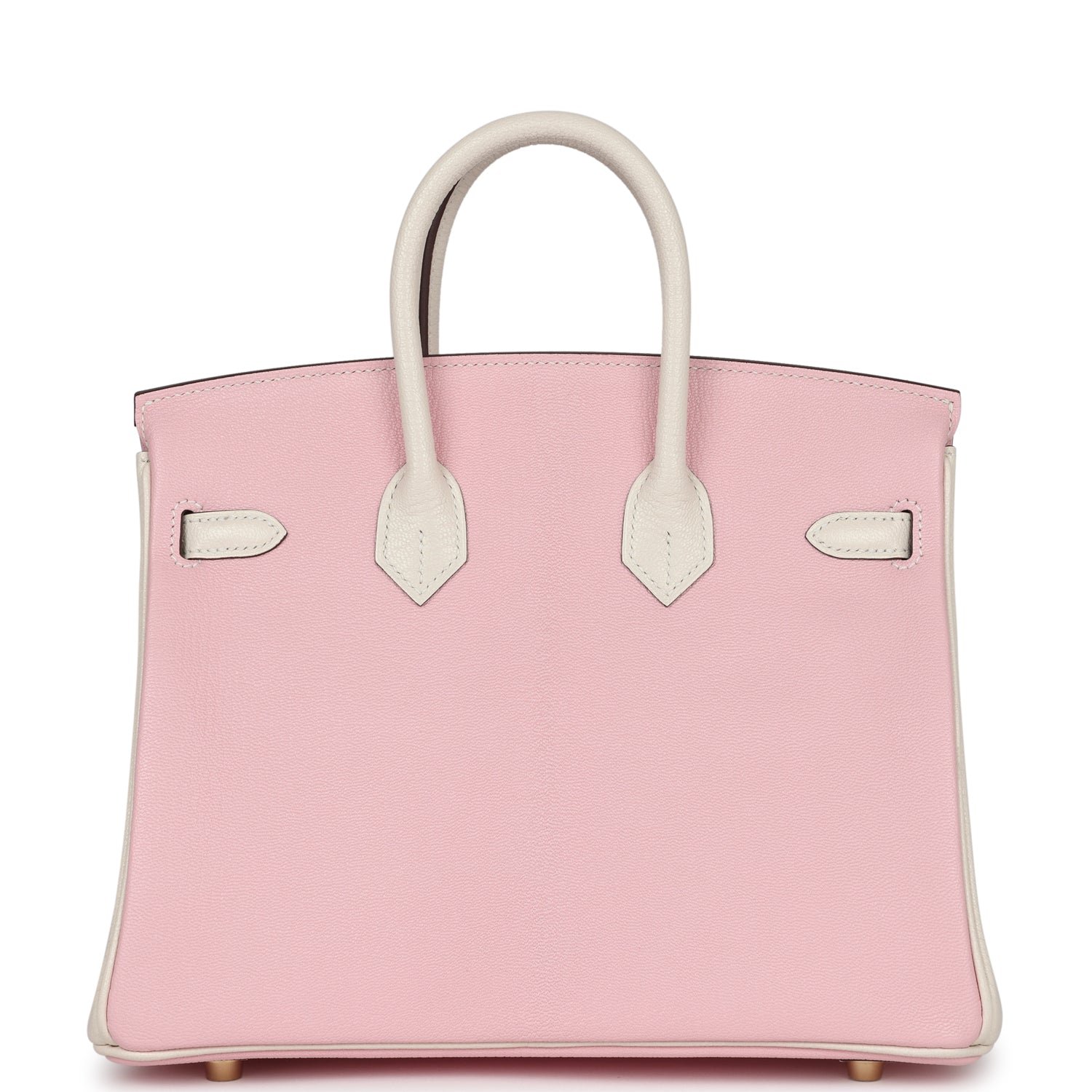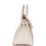 This Special Order Birkin 25 is in Rose Sakura and Nata chevre mysore leather with brushed gold hardware, has a mixture of tonal and contrast stitching, front flap, two straps with center toggle closure, clochette with lock and two keys, and double rolled handles.