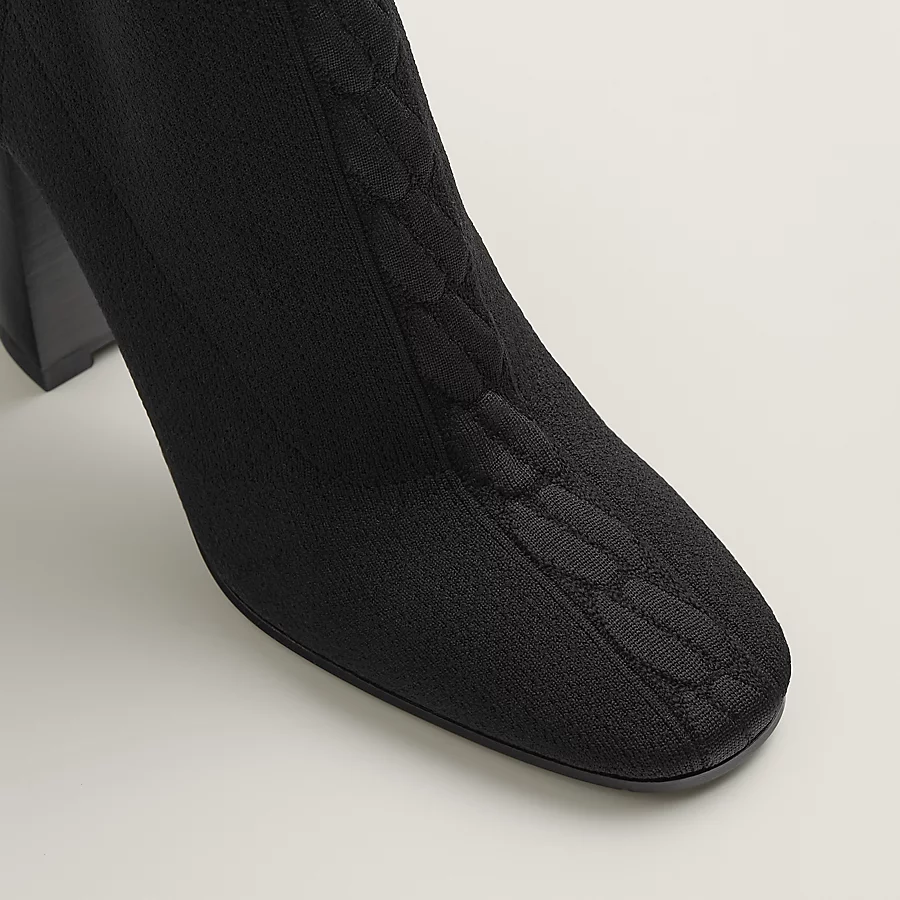 Ankle boot in knit and calfskin with ‘Clic! C’est Noue’ motif, Ex-Libris detail in calfskin and heel with horseshoe detail.