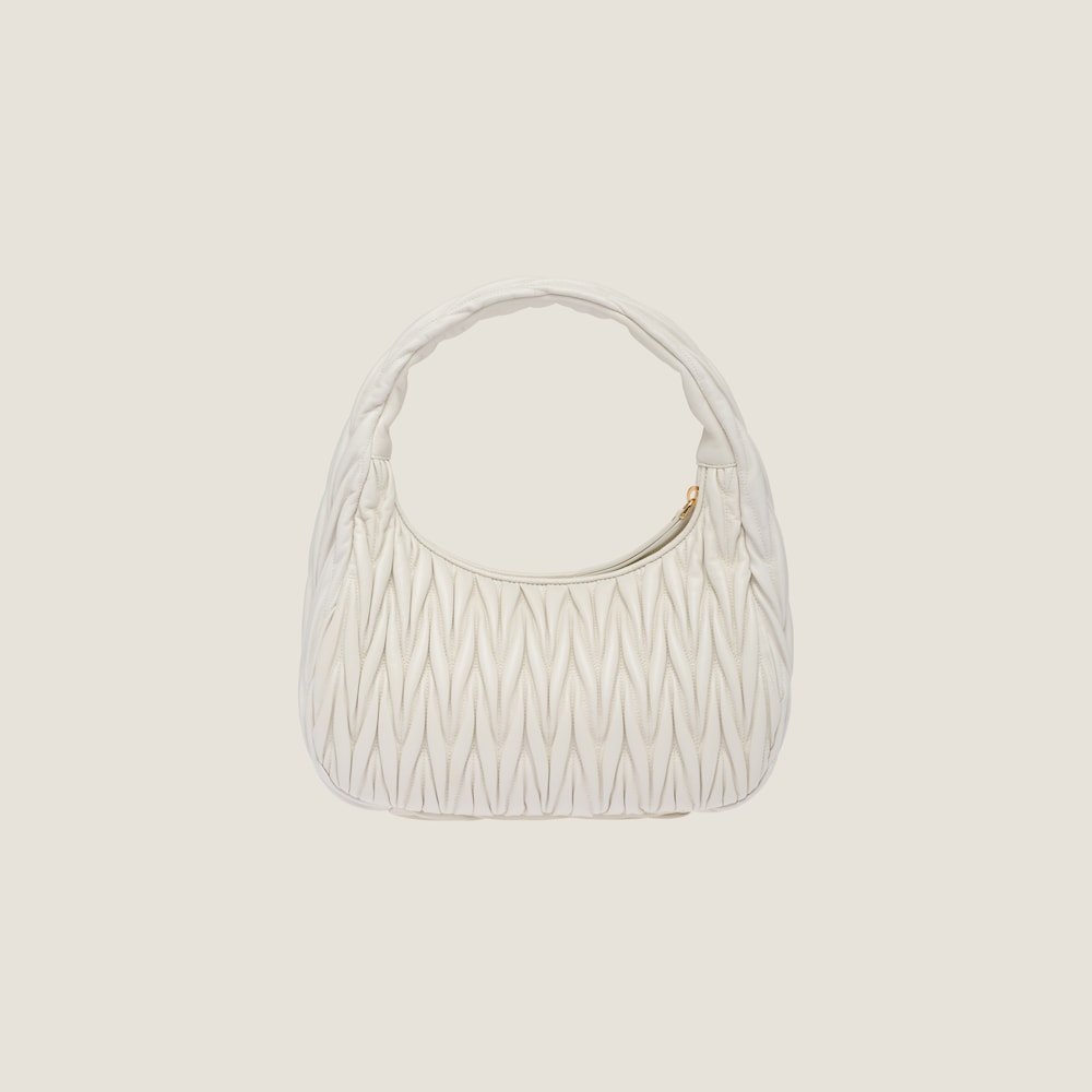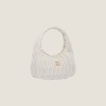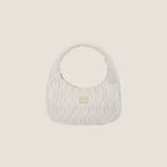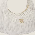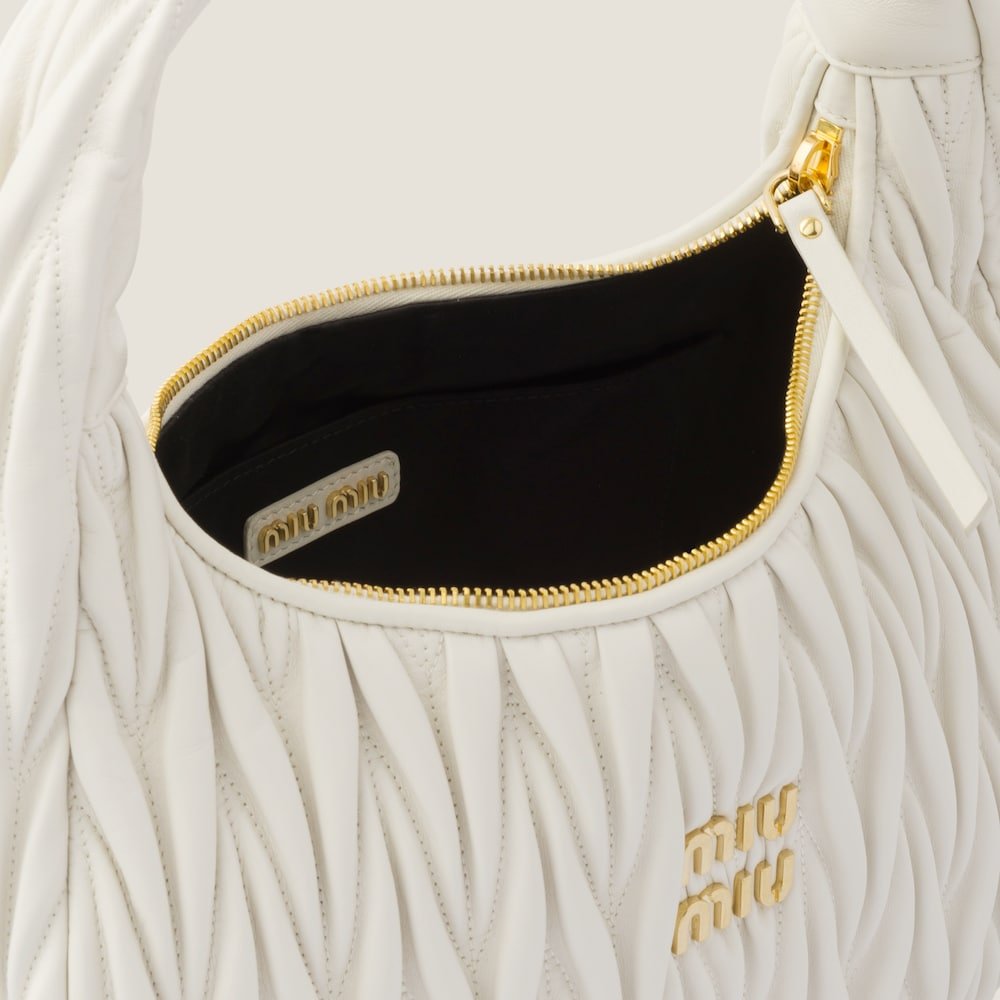The Wander bag, reinterpreted season after season, has become an iconic accessory of Miu Miu collections. $ Made in matelassé nappa leather, the bag is characterized by the sophisticated, three-dimensional created by the fine workmanship. The hobo shape, blending retro inspirations and contemporary elegance, becomes a new synonym of modern femininity.