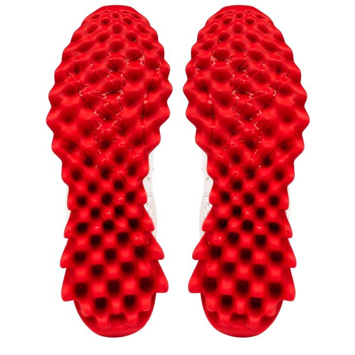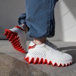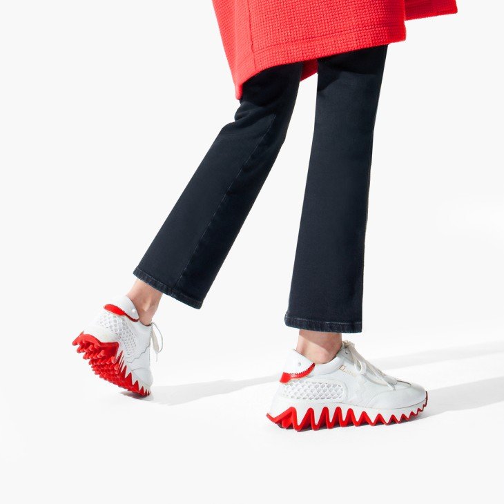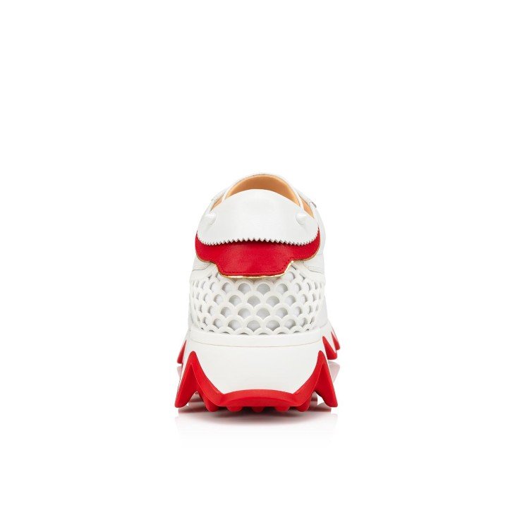 Cutting-edge design meets inimitable savoir-faire in the iconic Loubishark sneaker. This season features a carryover version in all-over Bianco white calfskin leather with signature red on the heel tab. The multi-piece construction is enhanced with a zigzag detail, tone-on-tone openwork heel counter and gold CL Paris varsity logo. The master stroke comes in the form of a serrated sole mimicking shark??s teeth, highlighted with signature red.