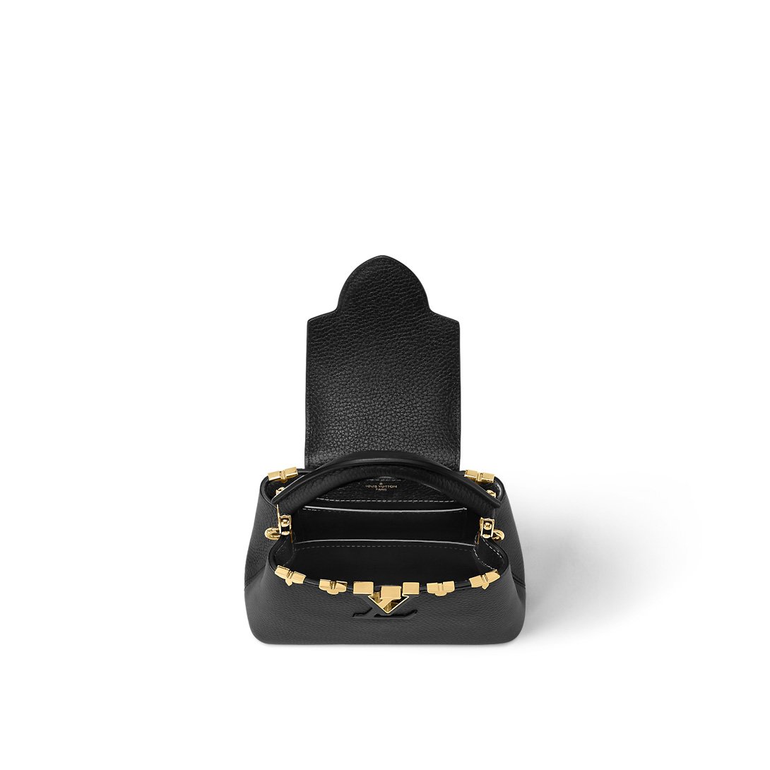 Fashioned from full-grain Taurillon leather, the now-classic Capucines BB handbag displays a host of House signatures:leather-wrapped LV Initials, jewel-like handle mounts inspired by historic trunks, and a distinctive flap with a Monogram Flower motif. Timelessly elegant, this charming model can be carried by hand or worn cross-body on its detachable strap. First launched in 2013, the Capucines is named for the Parisian street where Louis Vuitton first opened shop, in 1854.