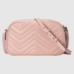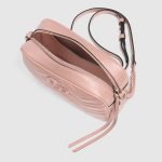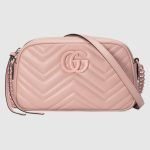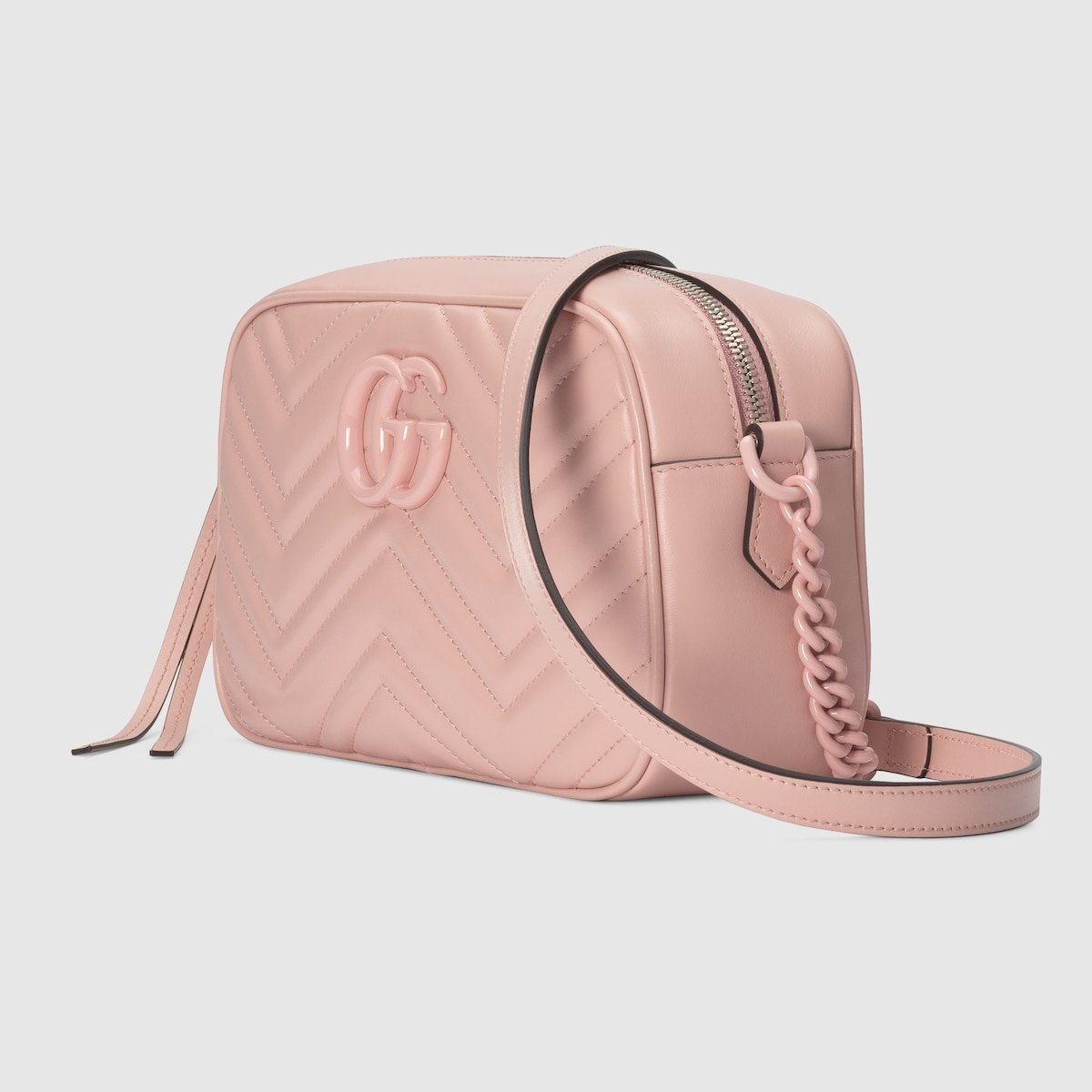 With its recognisable matelasse fabric and Double G hardware, the GG Marmont has become synonymous with the House. Continuously reinvented through the seasons, signature shapes are introduced in new colourways to match Gucci’s contemporary vision. This light pink small shoulder bag reveals a chevron base, further enhancing the tonal logo hardware.