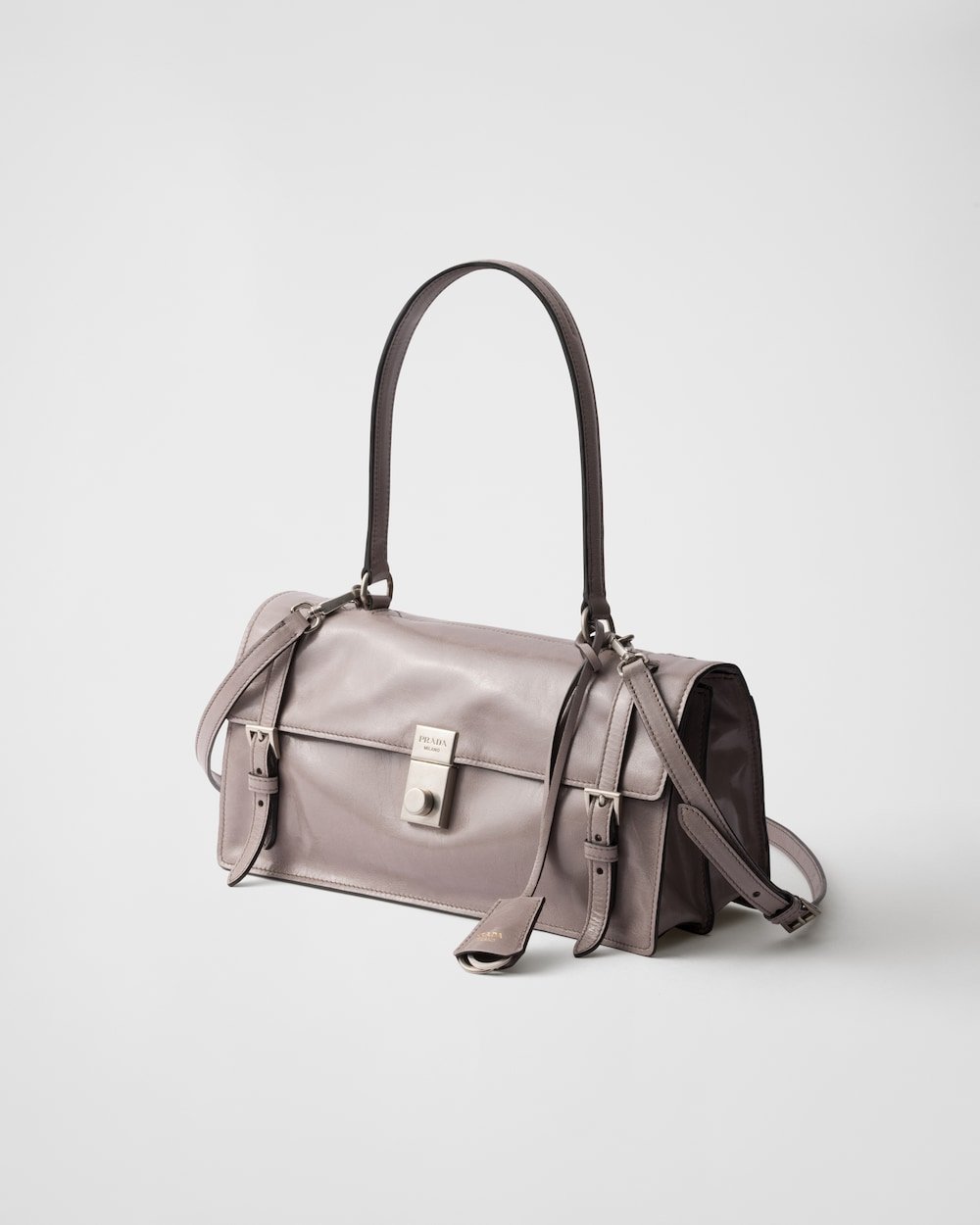 Inspired by rigid and formal work bags, this leather bag with a delicate glossy finish reinterprets classic office silhouettes with a new attitude. The archetypal shape is softened and enriched with sophisticated, feminine details. The vertical clasp, taken from the archives, embellishes the accessory characterized by a long handle that can also be worn over the shoulder.