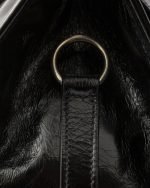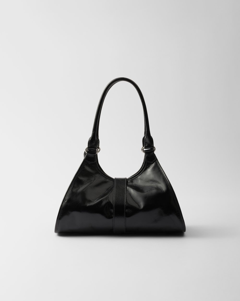 Geometric lines and refined artisan details define this bag with soft volumes. The trapezoidal silhouette features elongated handles to be worn with ease also as a shoulder bag. The vertical clasp inspired by the archives and the leather mirror complete the accessory with a sophisticated note.