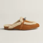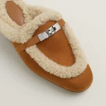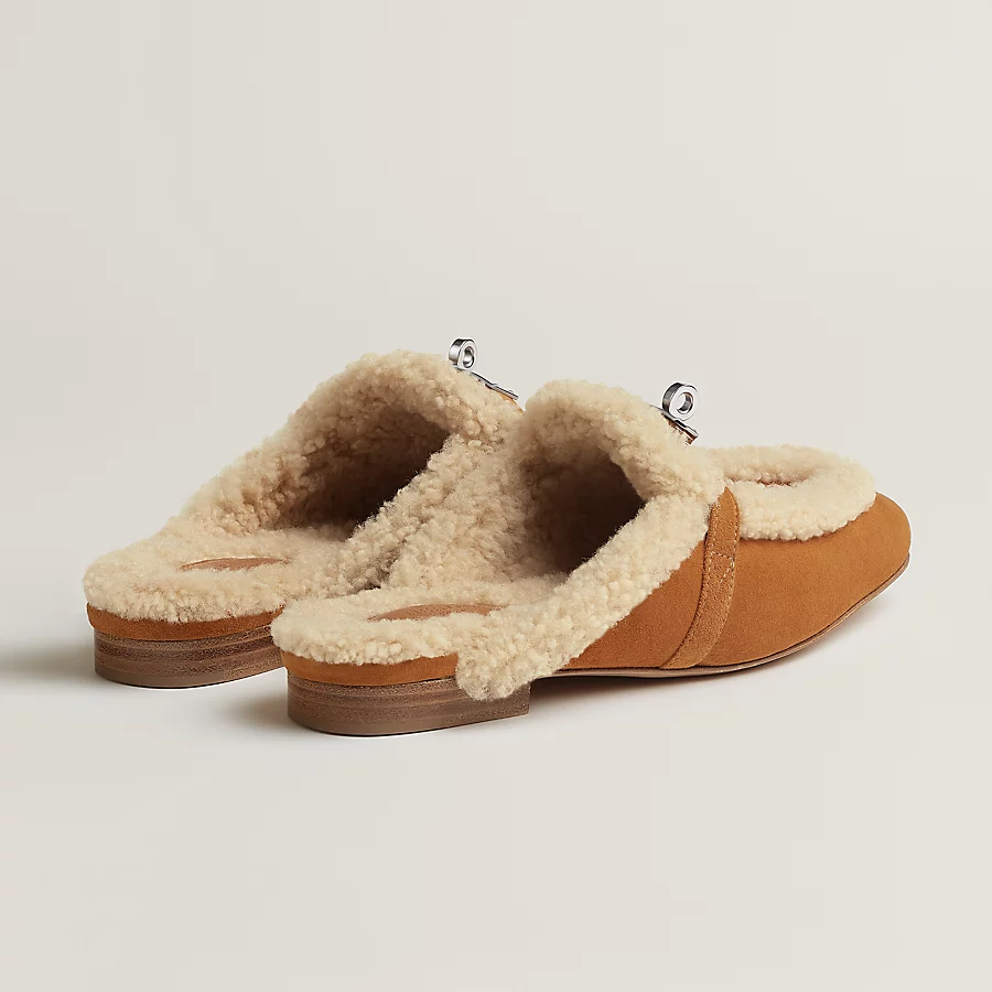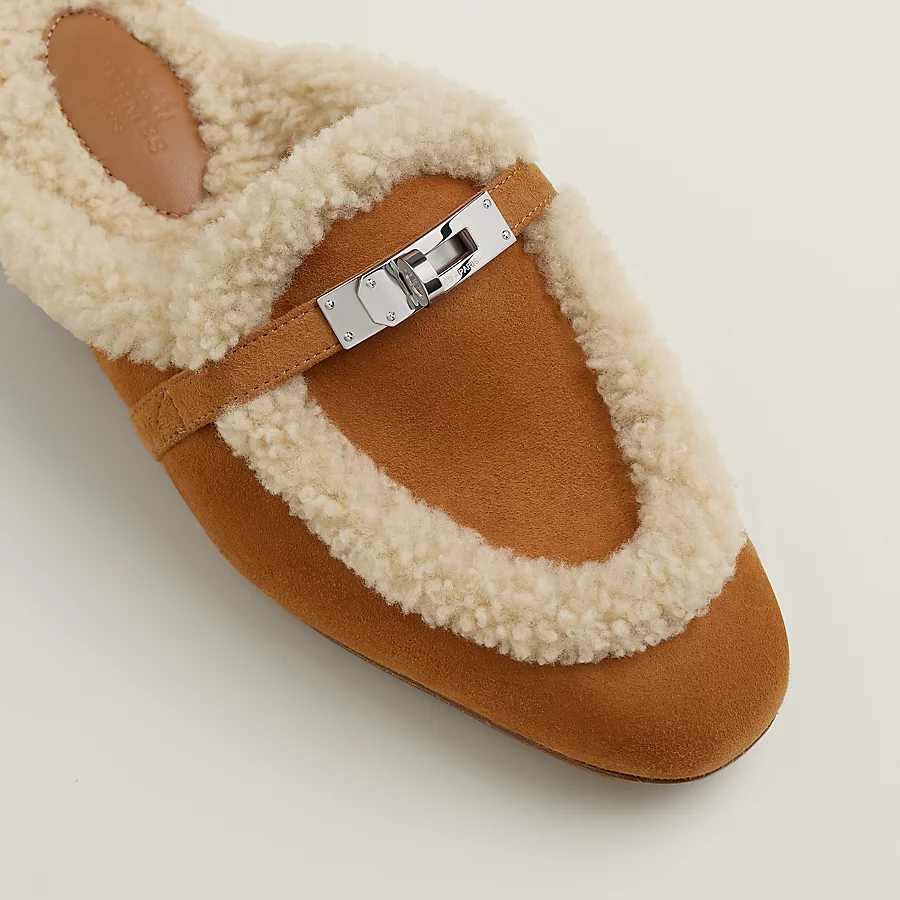 Mule in suede goatskin with shearling lining and iconic palladium-plated Kelly buckle.