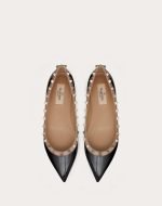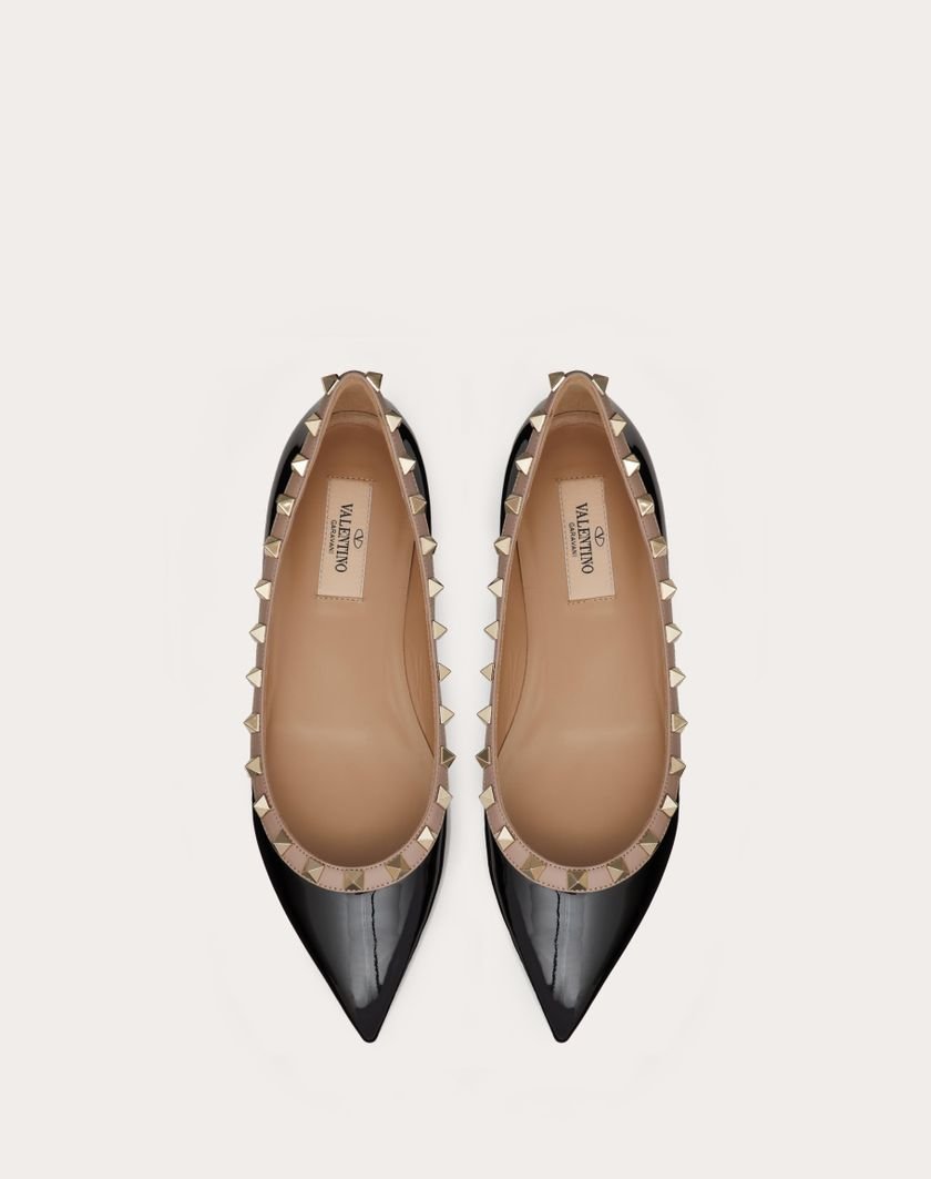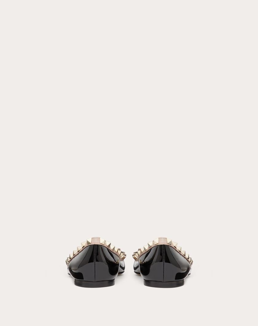 Valentino Garavani Rockstud ballerina in patent leather. Platinum-finish studs. Heel 5 mm/0.25′.
