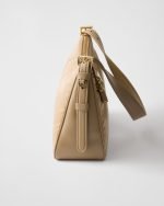 A modern and versatile design characterizes this shoulder bag, which is made of Re-Nylon with refined leather details. The roomy accessory with a zipper and padlock closure is decorated with the metal triangle logo.