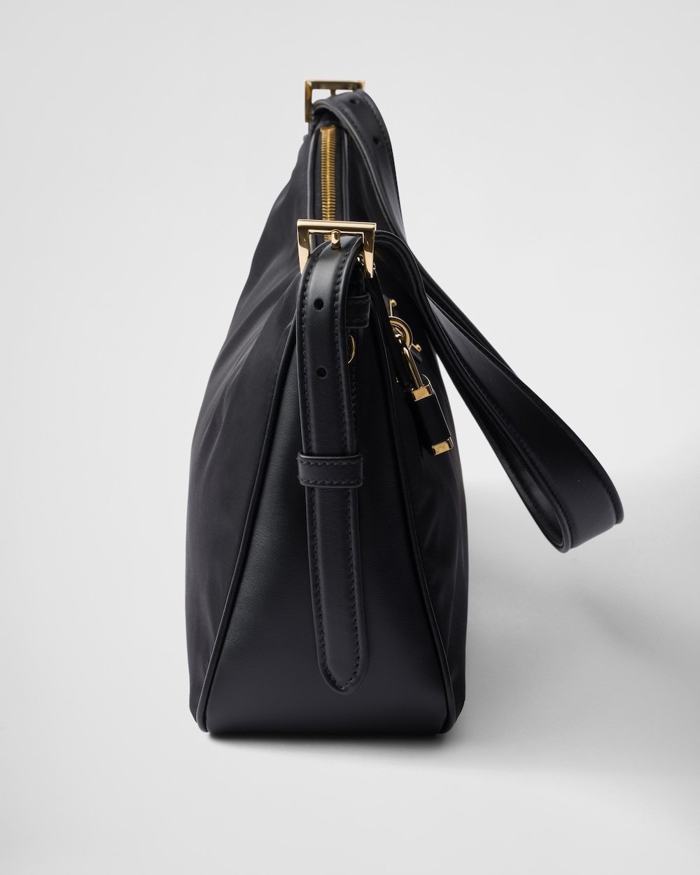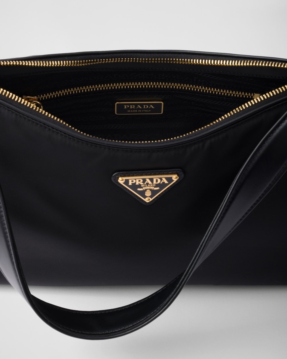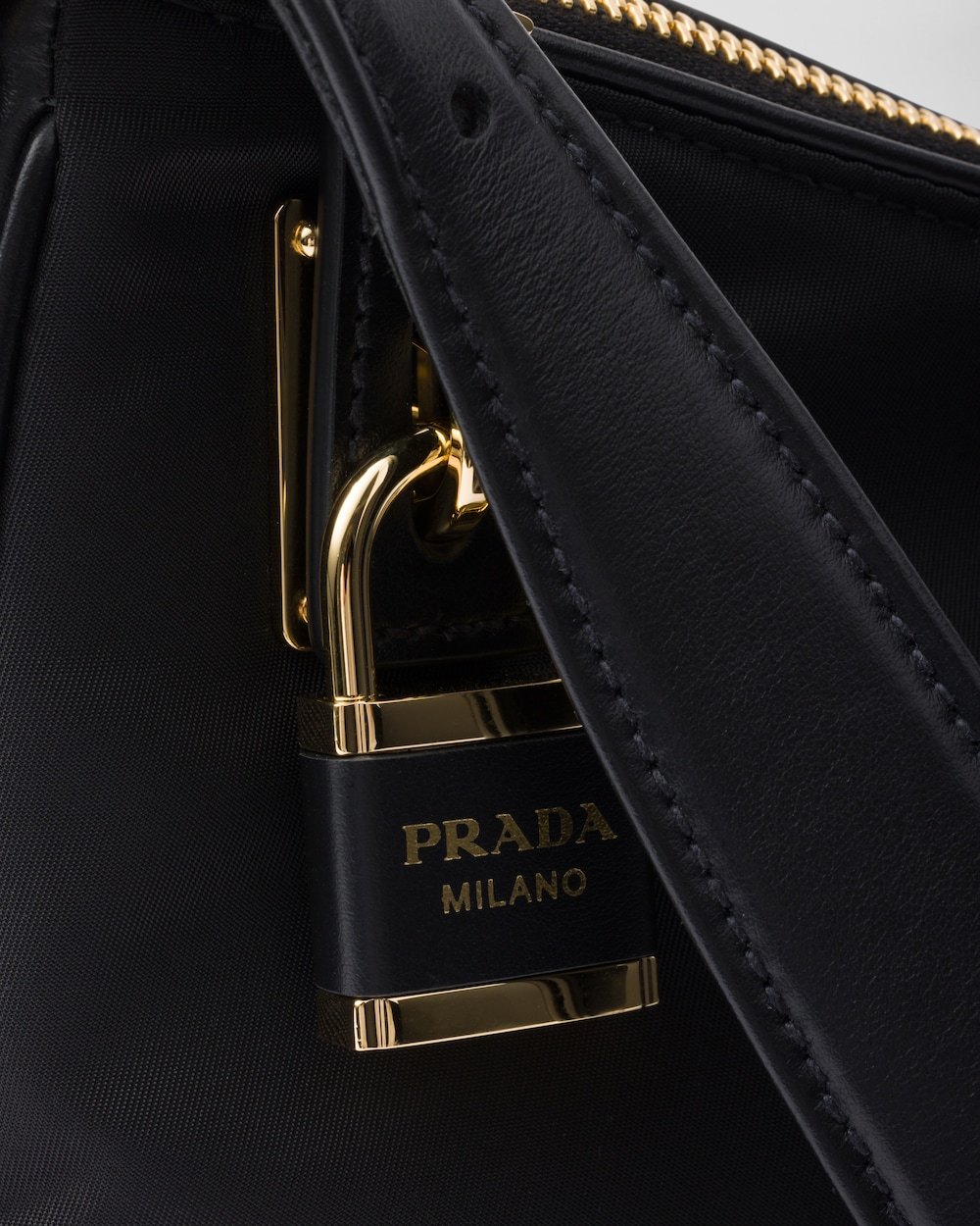 A modern and versatile design characterizes this shoulder bag, which is made of Re-Nylon with refined leather details. The roomy accessory with a zipper and padlock closure is decorated with the metal triangle logo.