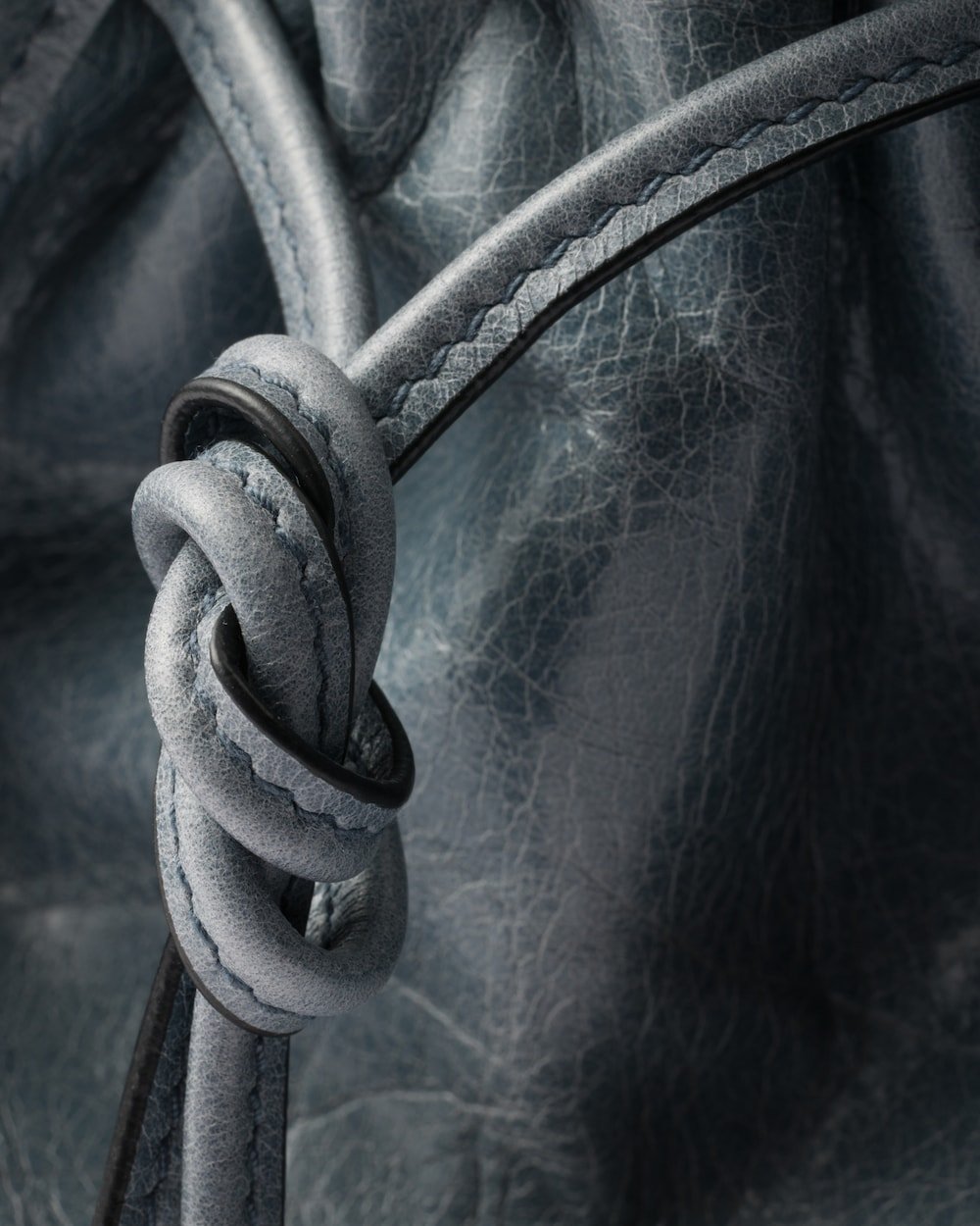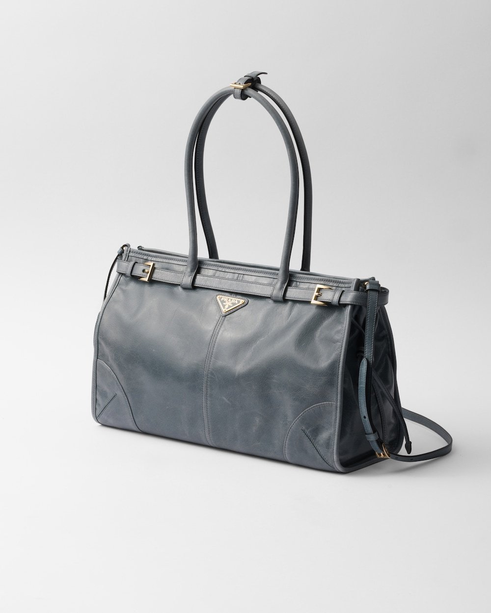 This pragmatic and refined handbag is made of soft leather with a glossy finish that emphasizes its versatile, modern allure. The geometric design blends different influences into one style with a distinctive but sleek aesthetic. Embellished by the sophisticated strap detail, the rectangular silhouette has a roomy interior with zipper pockets. The enameled metal triangle logo completes the look with its iconic signature.